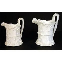 Two Victorian Parian jugs moulded with branches and ivy, lozenge marks to bases, largest 23cm hig…