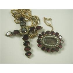 Two Victorian garnet set items: a cross pendant, 5cm long on a rope chain and a brooch also set with hair and seed pearls, 3cm long