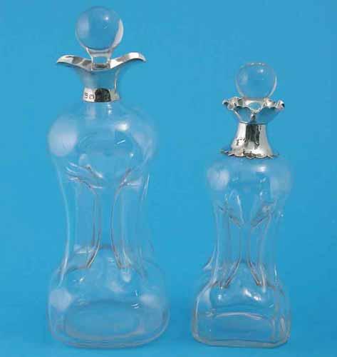Two Victorian hour glass decanters and stoppers, with silver collars, Birmingham 1887 and London 1890, 10ins and 8.5ins £100-150