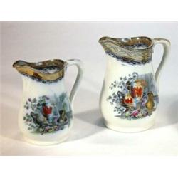 Two Victorian pottery jugs, transfer printed and hand coloured with urns and flowers, largest 17c…