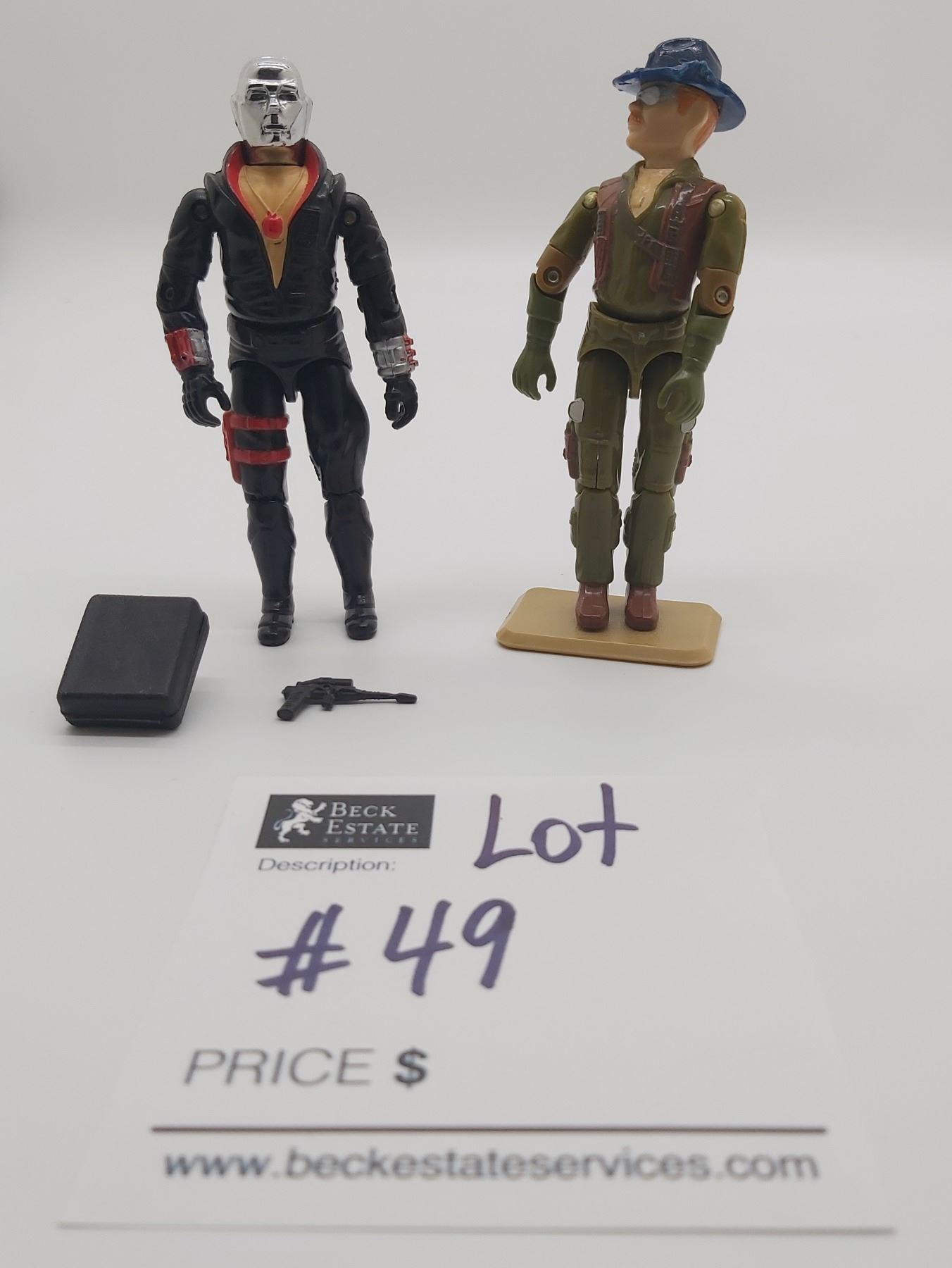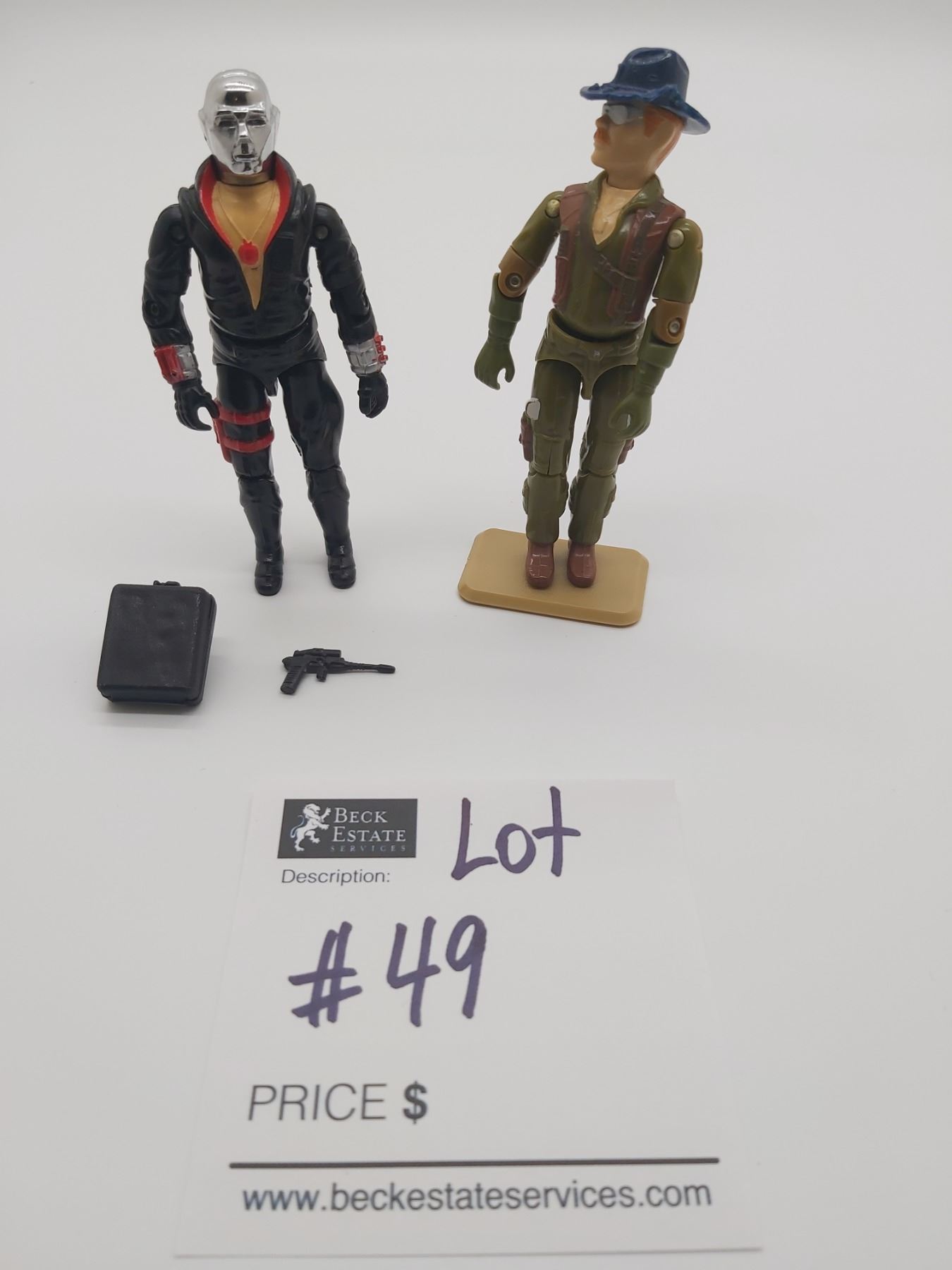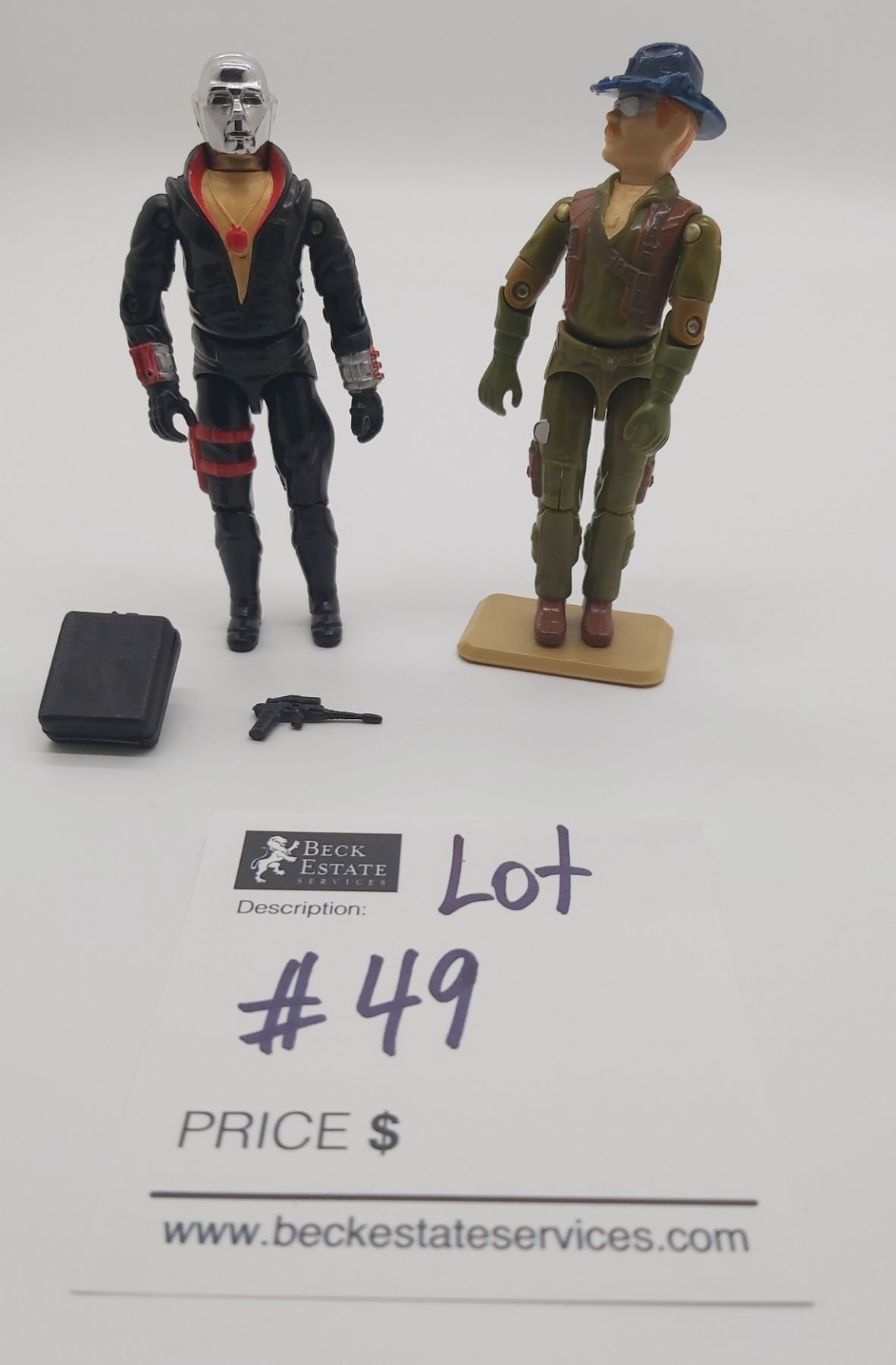 Two Vintage 3 3/4 Inch GI Joe Action Figures Destro 1983 and Wild Bill 1983 Destro is 100% Complete with his high density laser gun and attaché case. Wild Bill's hat has been chewed, and his torso elastic is loose. He came exclusively with the Dragonfly Assault Copter. Figure stand not included.