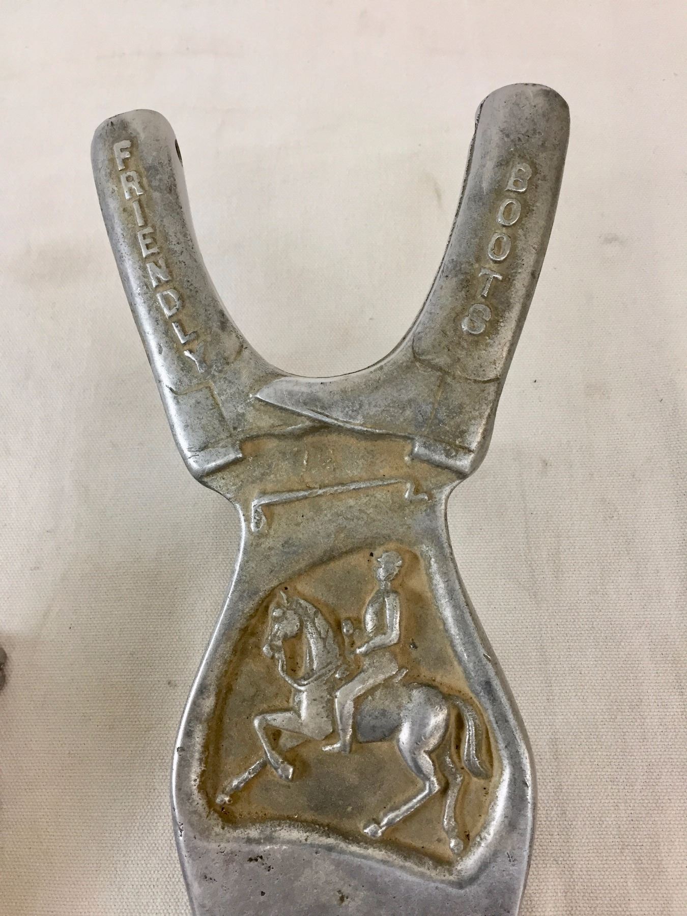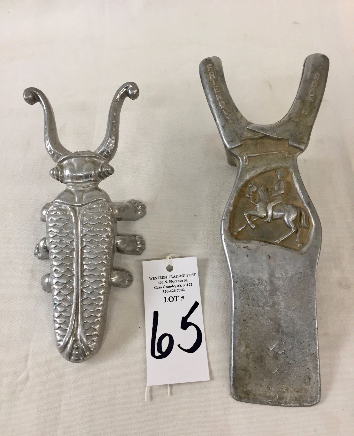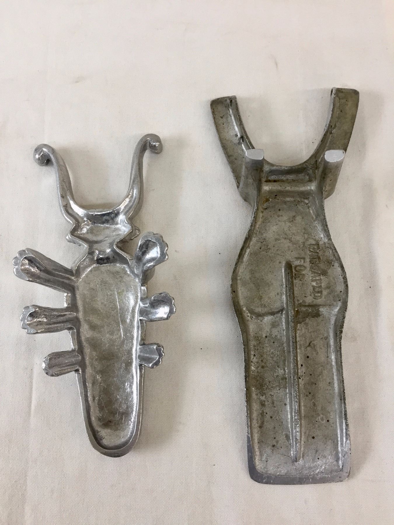Description: Two old aluminum boot jacks, one in the ever popular, Bug, design and the other is horse themed. Maker: Unknown. Approx. Age: Vintage. Size: 5”w x 12” long x 3” deep and 4-1/4”w x 10” long and 3-3/8” deep. Condition: Good for its age, normal wear expected. Please look closely at the pictures - they are an important part of our description. Shipping: There will be a $5 handling / packaging fee for shipping this lot. The actual cost of postage will be added on top of that.