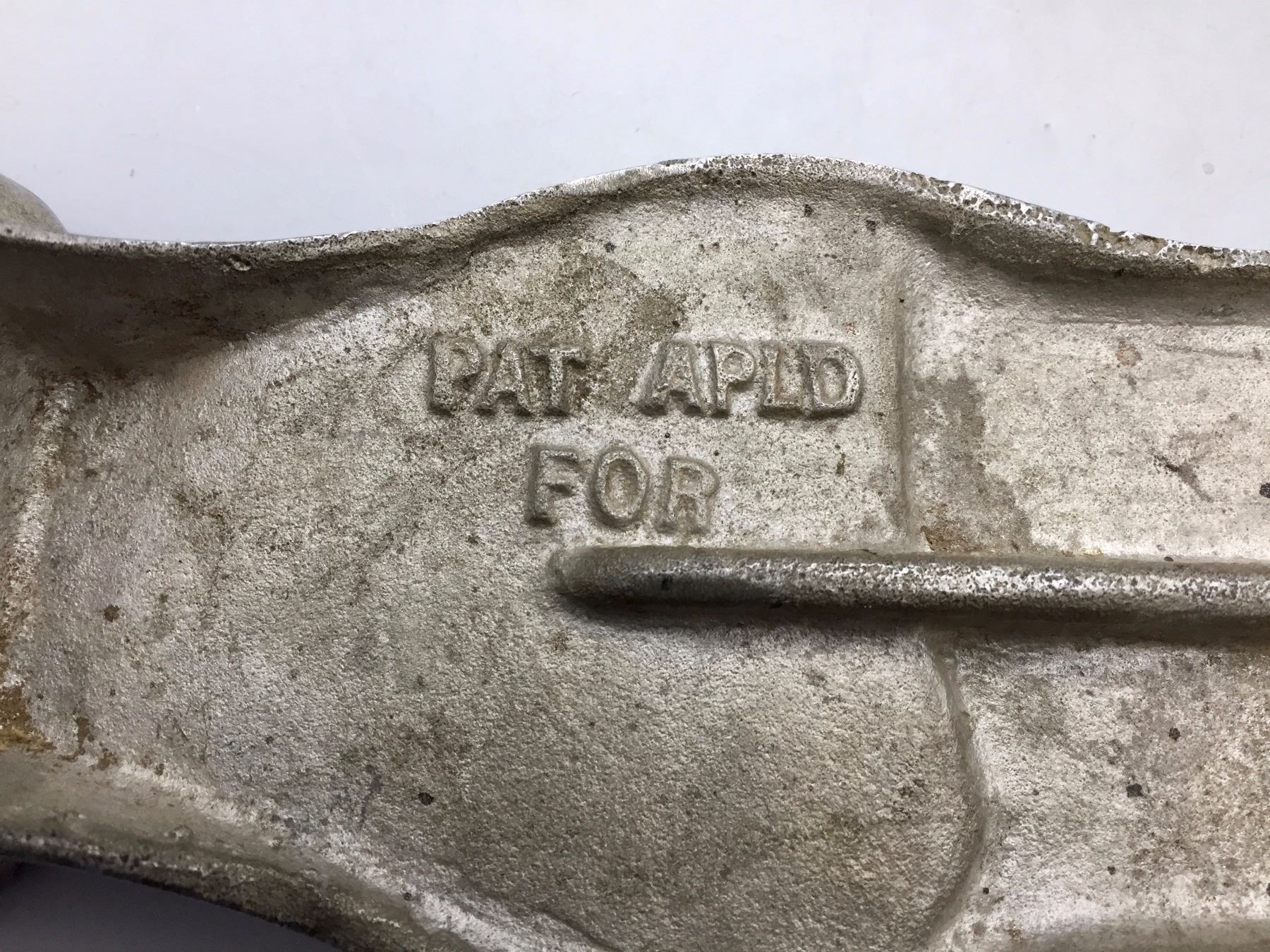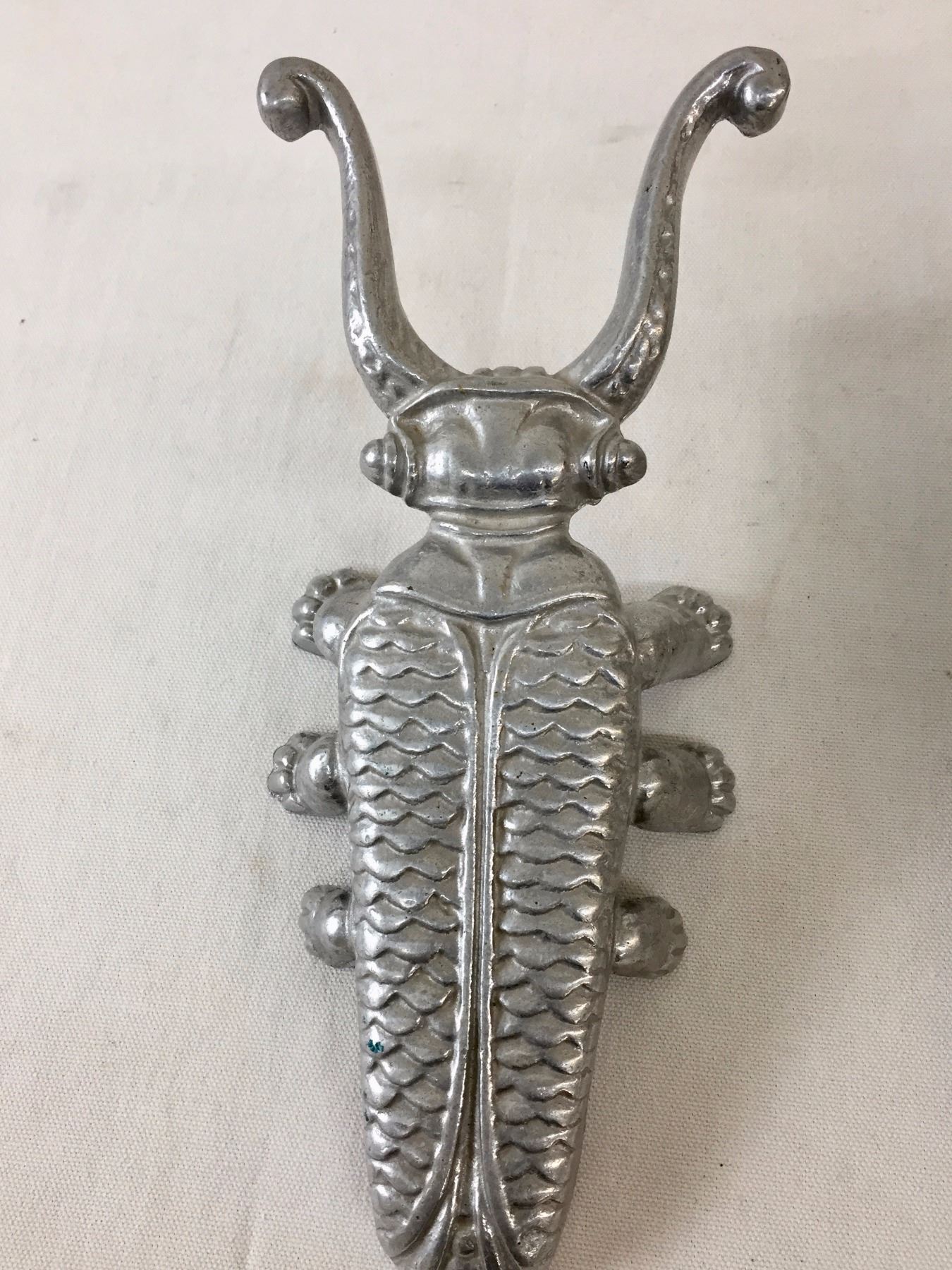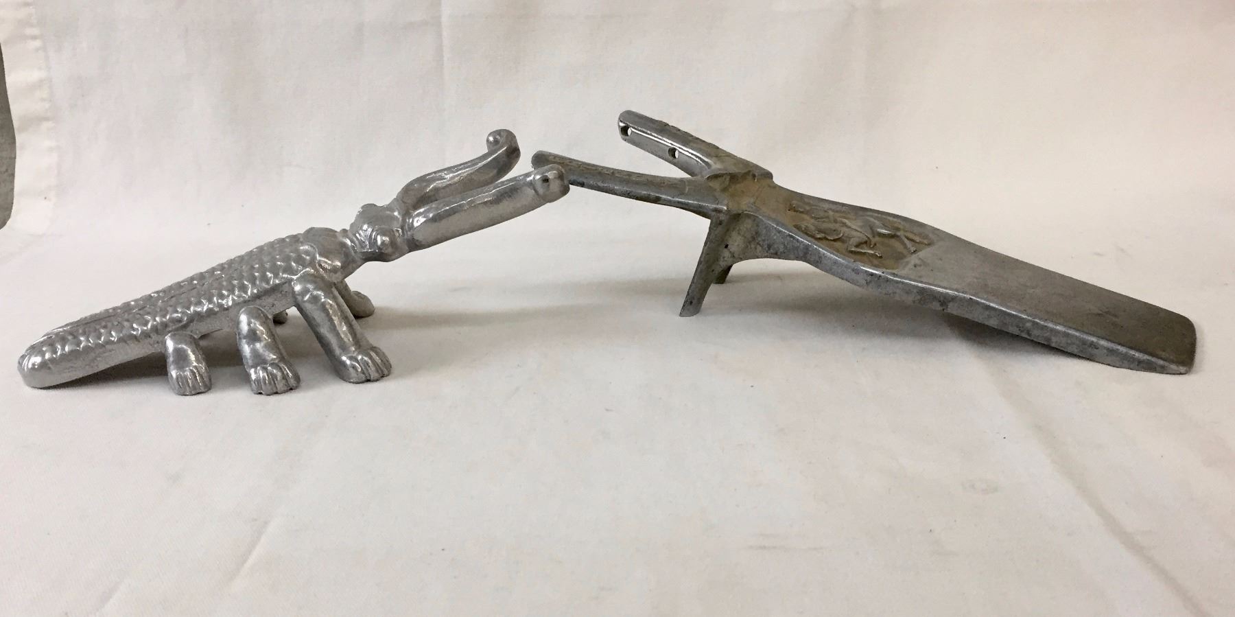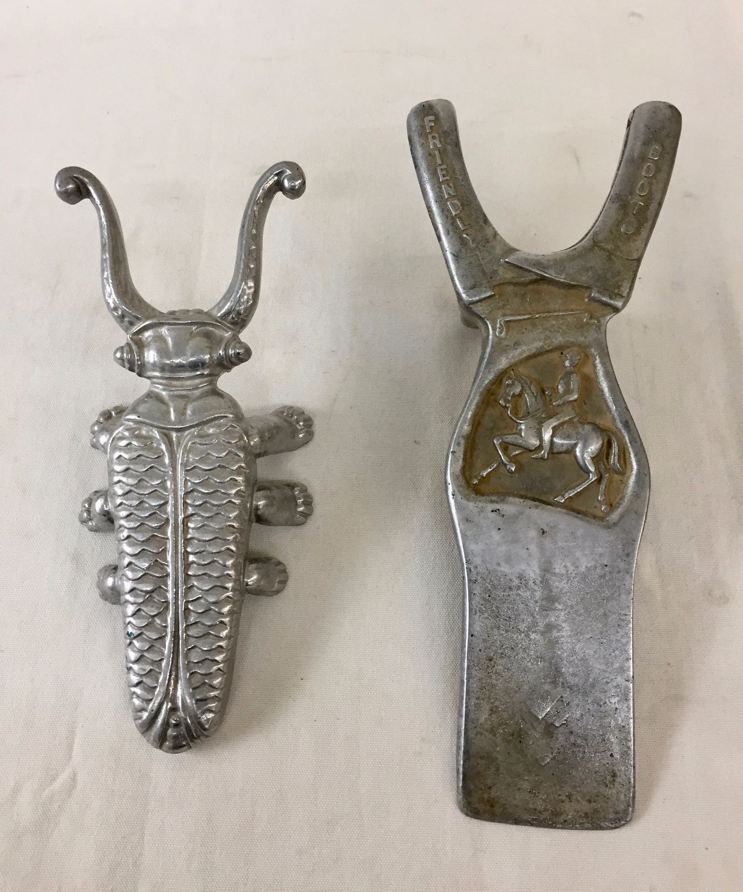 Description: Two old aluminum boot jacks, one in the ever popular, Bug, design and the other is horse themed. Maker: Unknown. Approx. Age: Vintage. Size: 5”w x 12” long x 3” deep and 4-1/4”w x 10” long and 3-3/8” deep. Condition: Good for its age, normal wear expected. Please look closely at the pictures - they are an important part of our description. Shipping: There will be a $5 handling / packaging fee for shipping this lot. The actual cost of postage will be added on top of that.