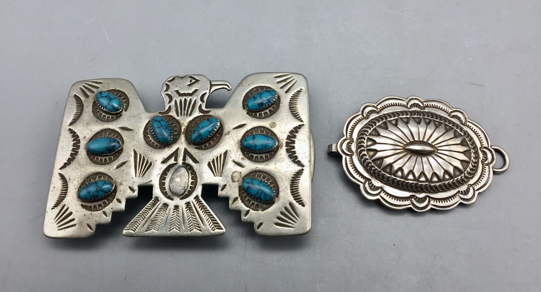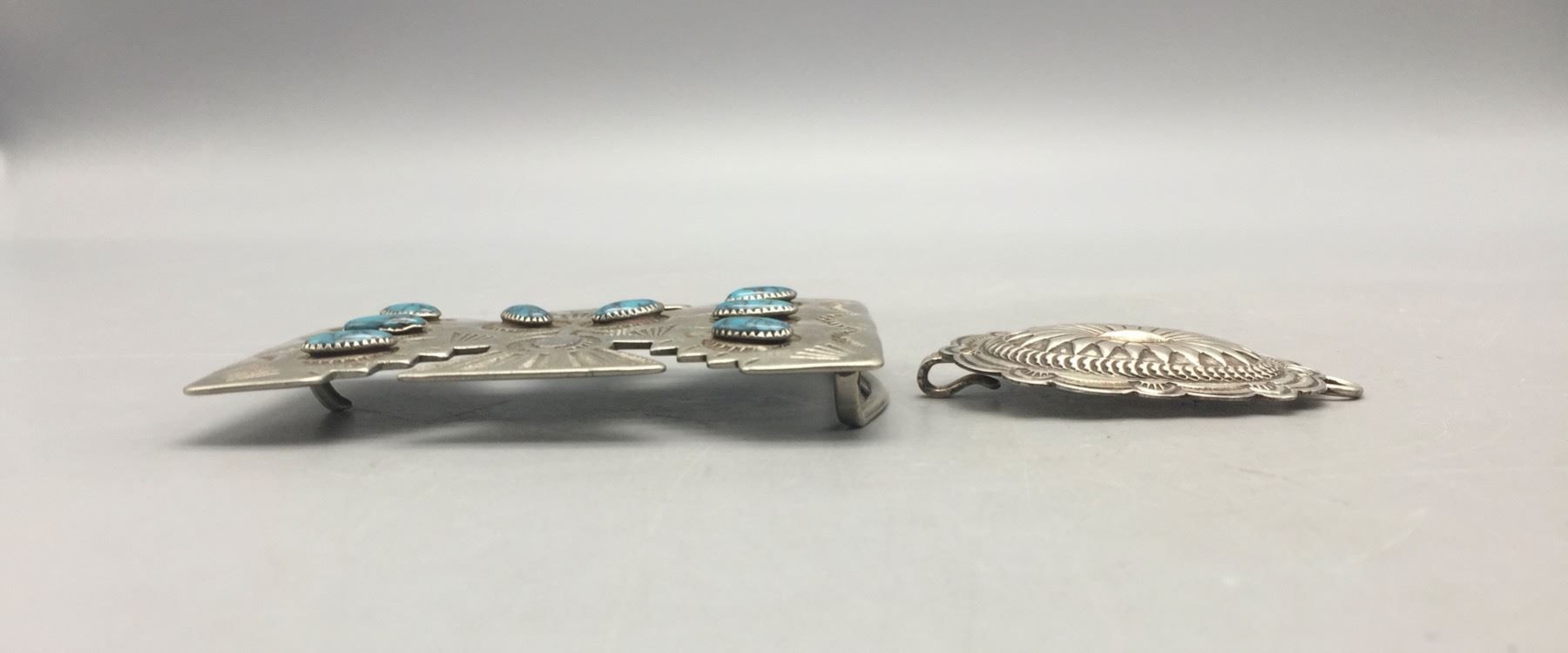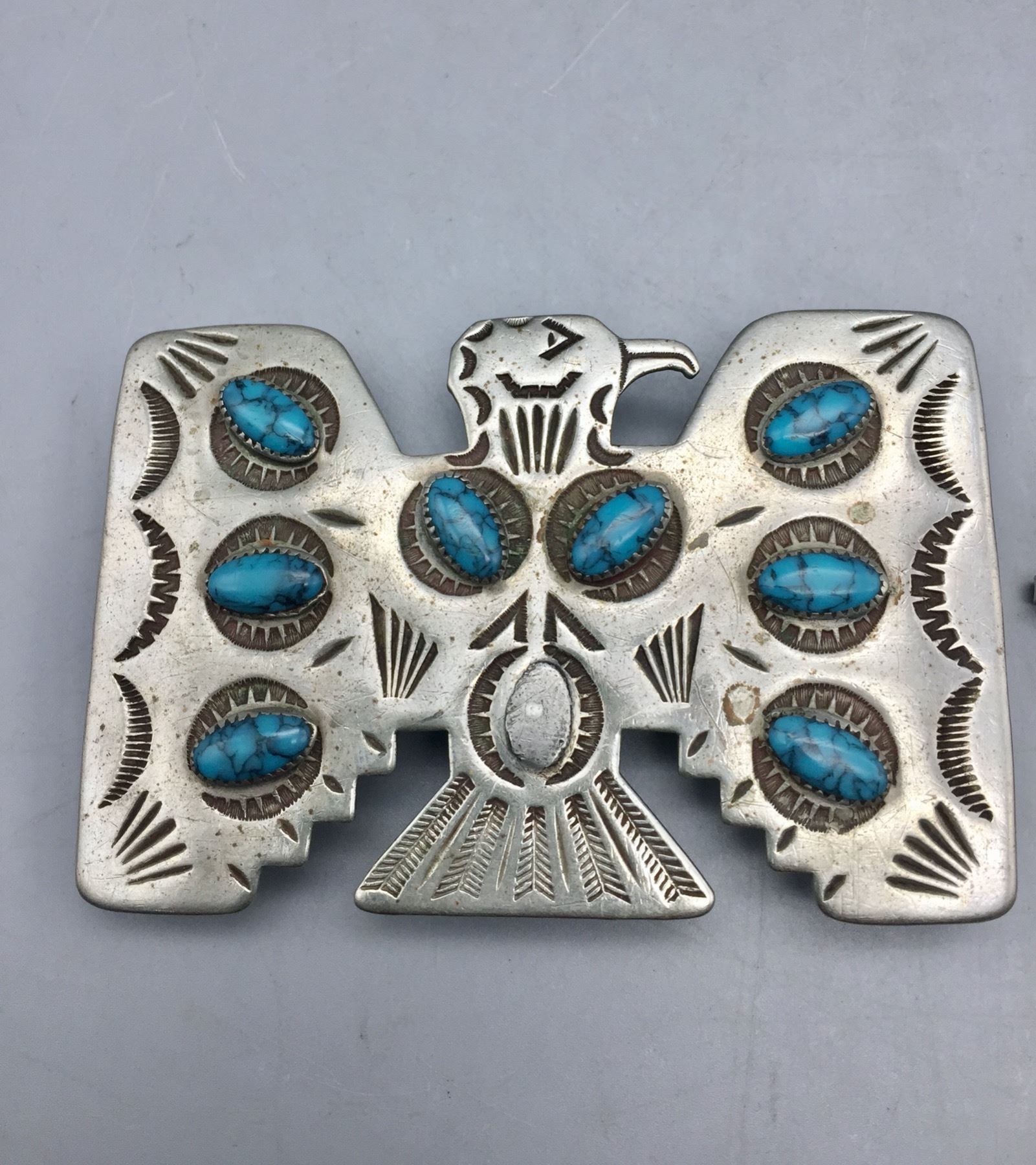 Description: Offered for sale in this lot is an old tourist thunderbird theme belt buckle and also a belt buckle an old link concho belt. Items are from the old Jewel Box Collection, which was a well known business in the Phoenix, AZ area from the 1950s - 2000. Some of their pieces were even featured in the popular 1970s Arizona Highways Magazines. The thunderbird buckle is by Frontier Buckles and is made from nickel silver. The link Concho belt, belt buckle is sterling silver. Maker: Frontier buckles and unknown. Approx. Age: Vintage. Size: Buckle measures 3-3/8” wide X 2-1/4” tall. Total weight is 72.4 grams. Condition: Good for their age, normal wear expected. Please look closely at the pictures - they are an important part of our description. Shipping: There will be a $5 handling / packaging fee for shipping this lot. The actual cost of postage will be added on top of that.