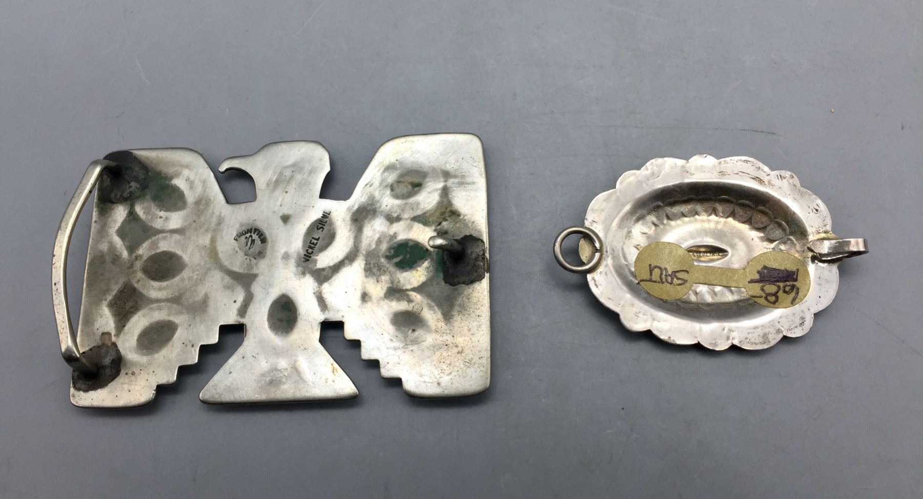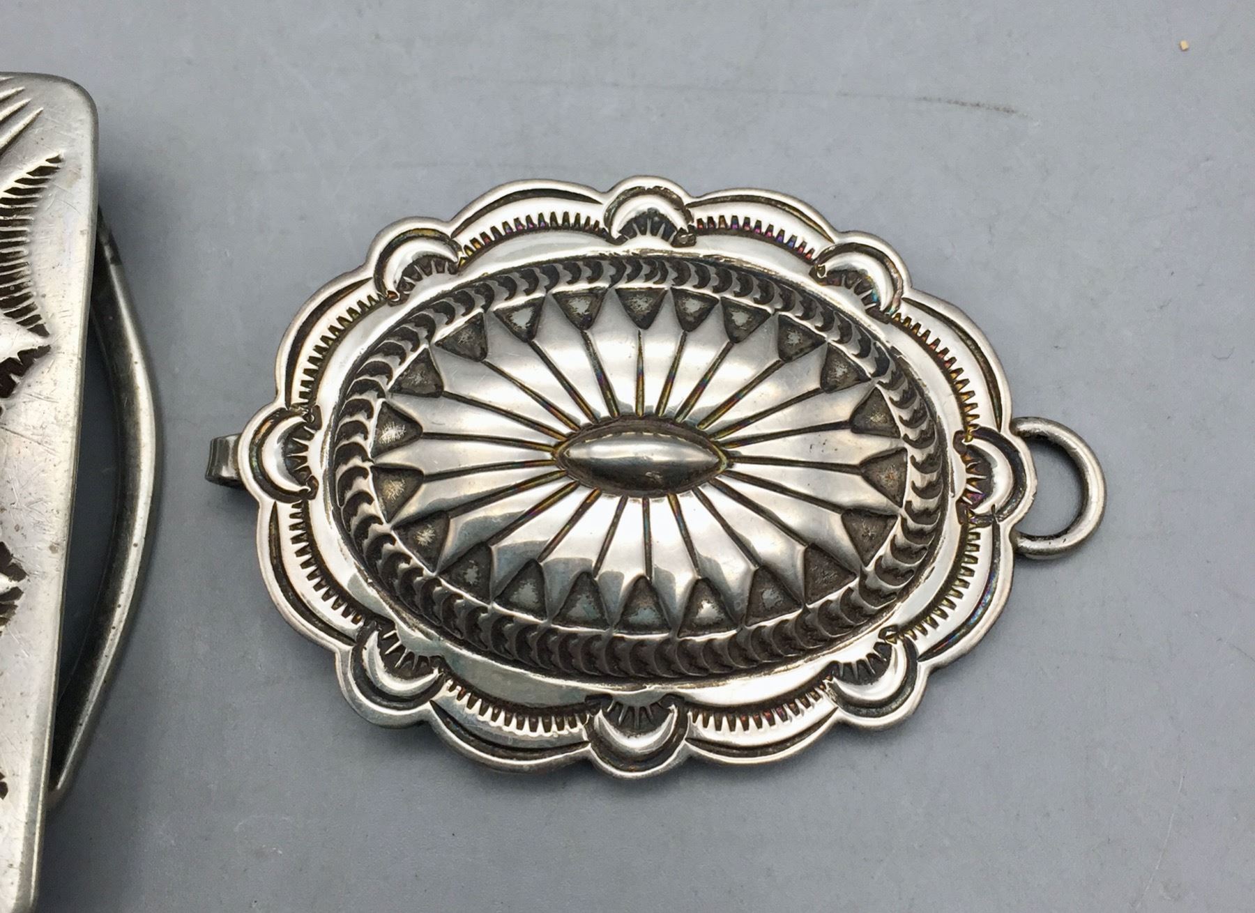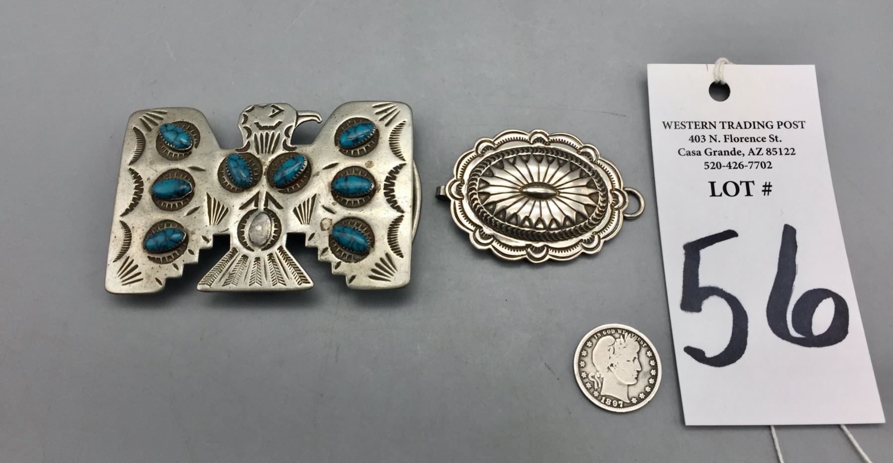 Description: Offered for sale in this lot is an old tourist thunderbird theme belt buckle and also a belt buckle an old link concho belt. Items are from the old Jewel Box Collection, which was a well known business in the Phoenix, AZ area from the 1950s - 2000. Some of their pieces were even featured in the popular 1970s Arizona Highways Magazines. The thunderbird buckle is by Frontier Buckles and is made from nickel silver. The link Concho belt, belt buckle is sterling silver. Maker: Frontier buckles and unknown. Approx. Age: Vintage. Size: Buckle measures 3-3/8” wide X 2-1/4” tall. Total weight is 72.4 grams. Condition: Good for their age, normal wear expected. Please look closely at the pictures - they are an important part of our description. Shipping: There will be a $5 handling / packaging fee for shipping this lot. The actual cost of postage will be added on top of that.