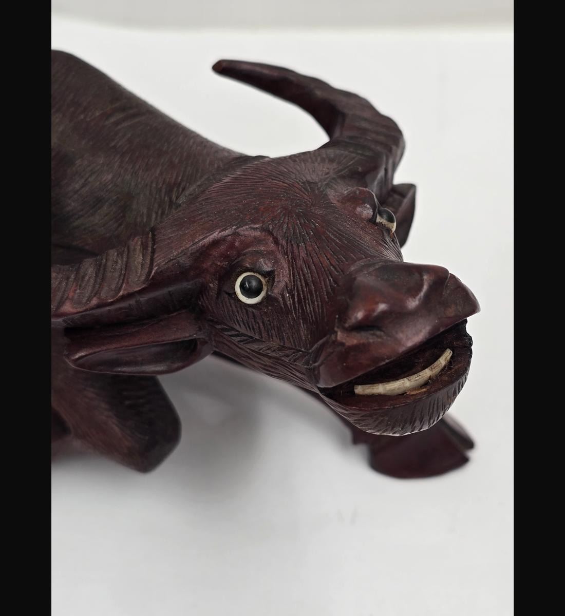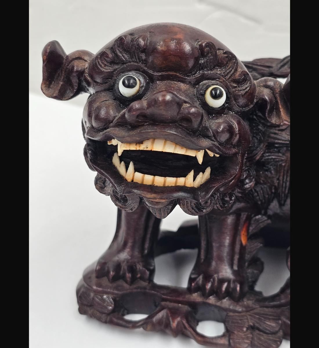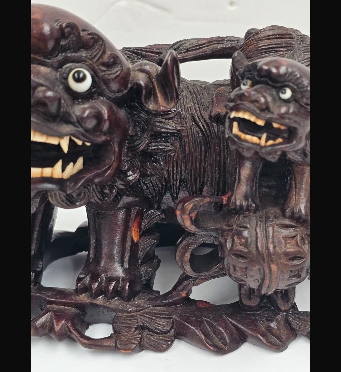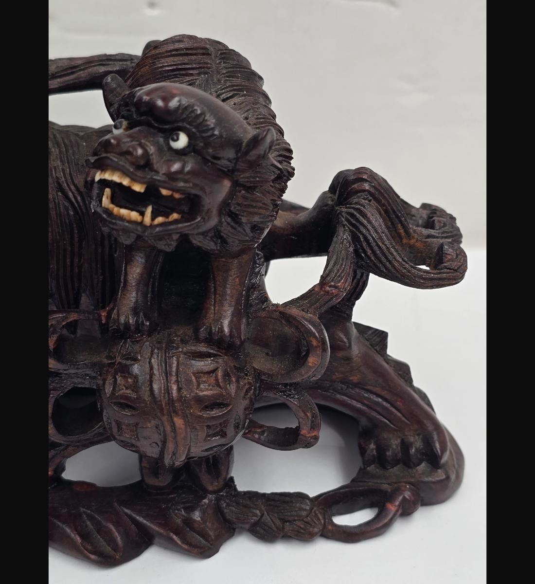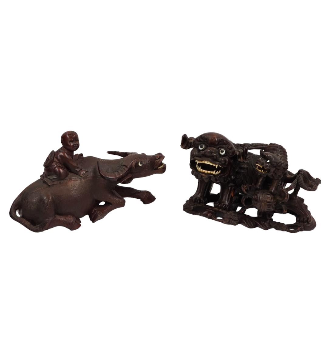 Two Vintage Chinese Carved Wood Figures Foo Dogs And Cow. Dogs Measures approx 6 1/4" X 3 3/4" X 3", Cow 7" X 4". Provenance: One Person Private Estate Central Florida.