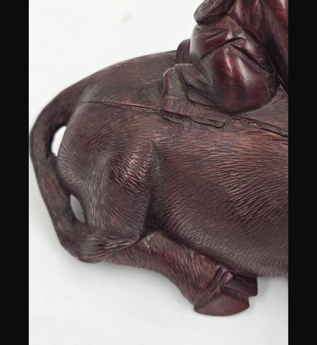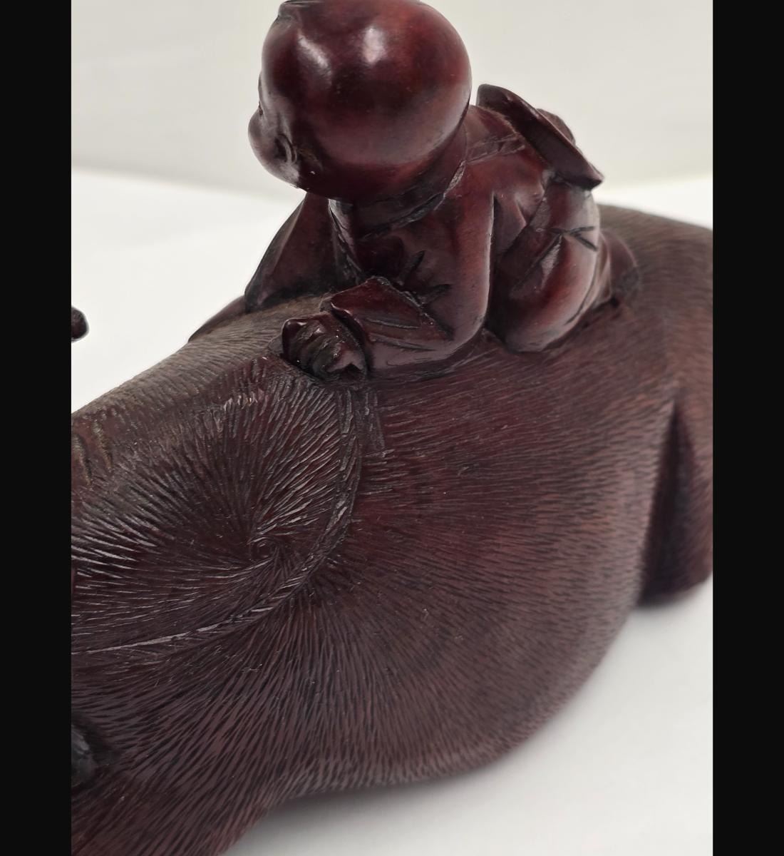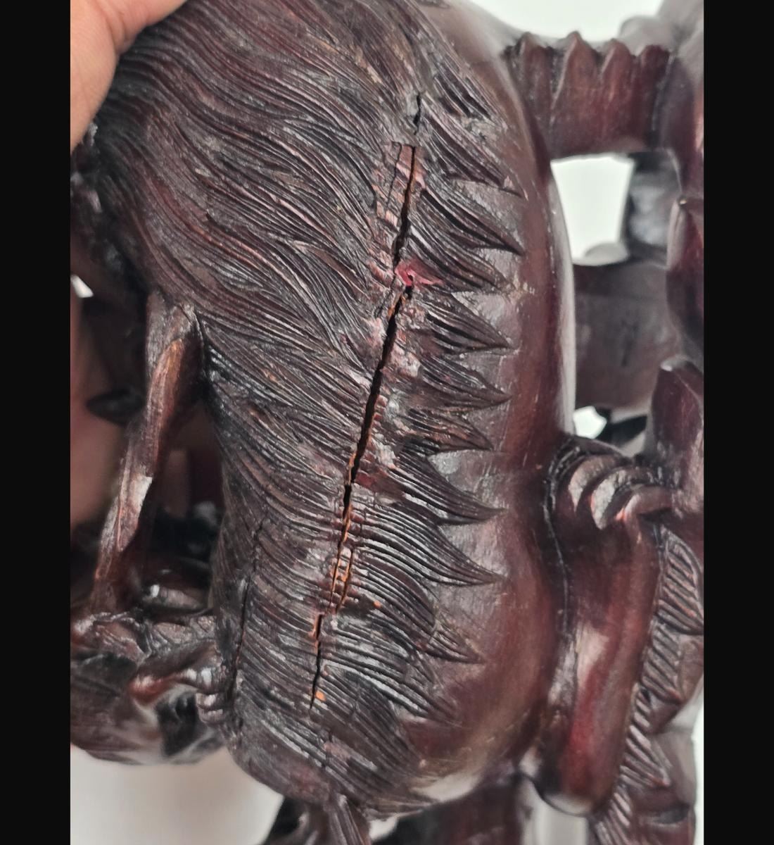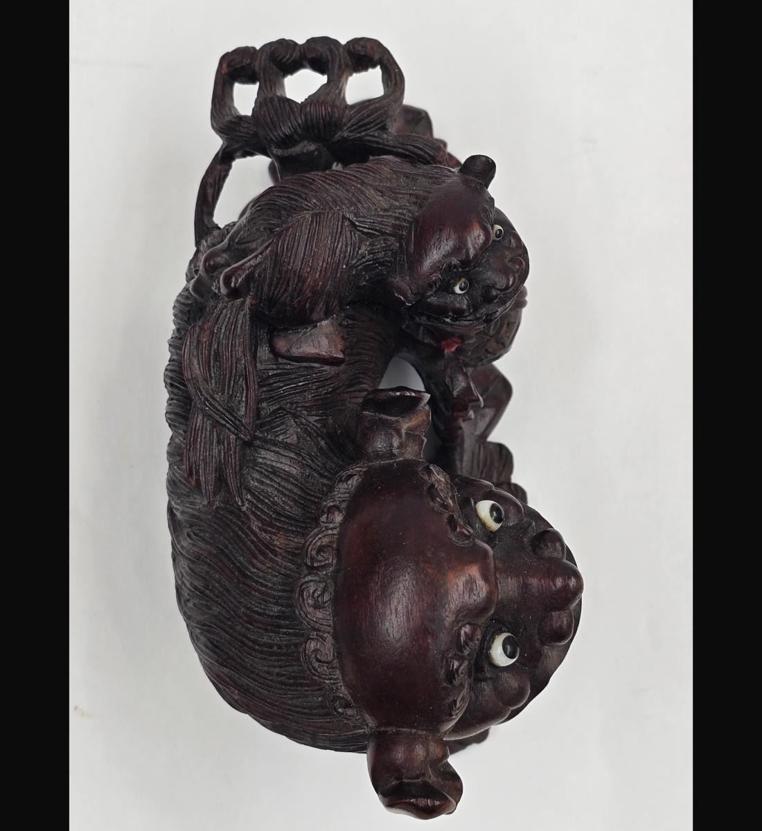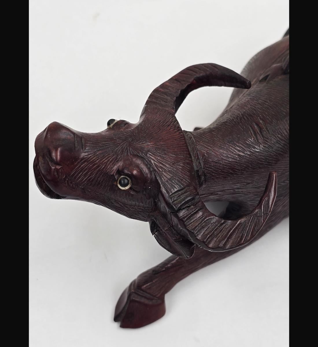 Two Vintage Chinese Carved Wood Figures Foo Dogs And Cow. Dogs Measures approx 6 1/4" X 3 3/4" X 3", Cow 7" X 4". Provenance: One Person Private Estate Central Florida.