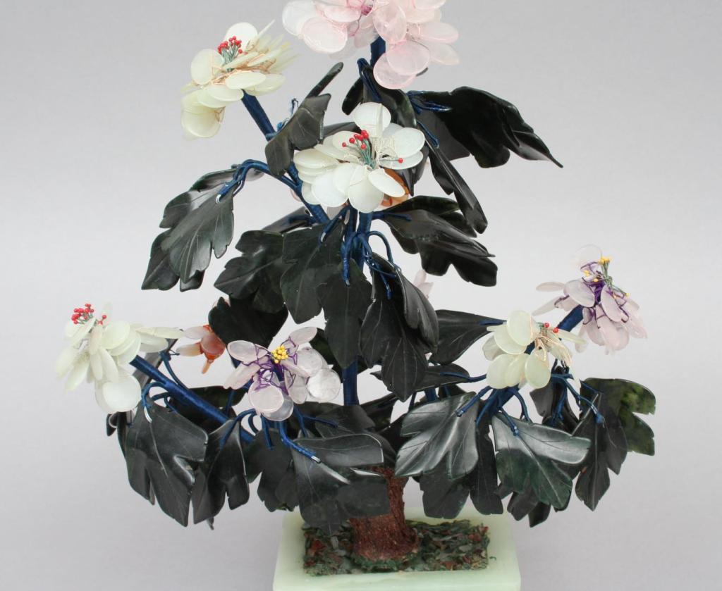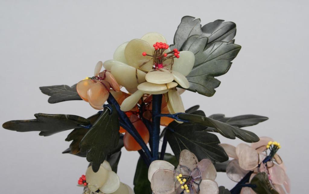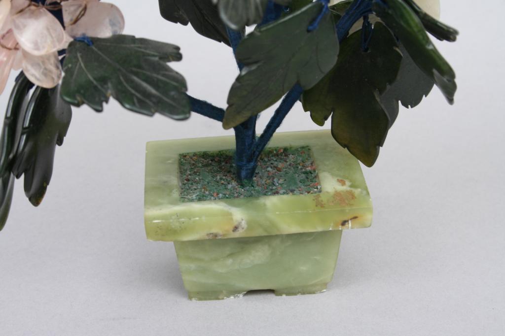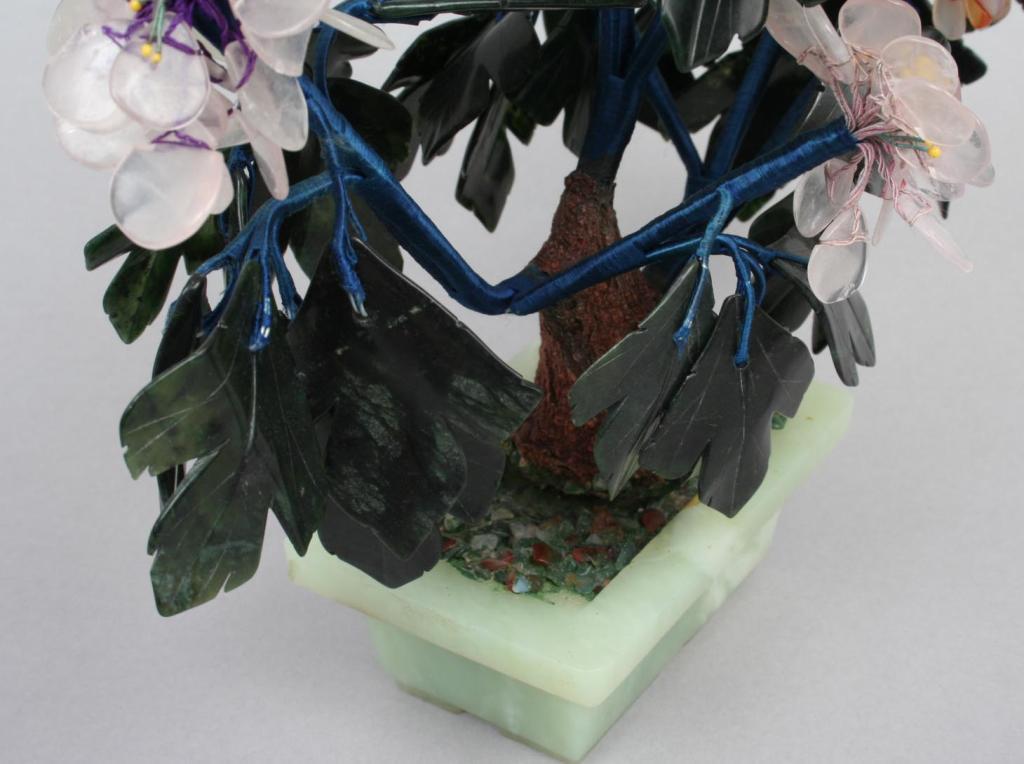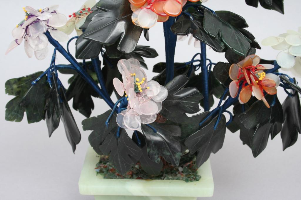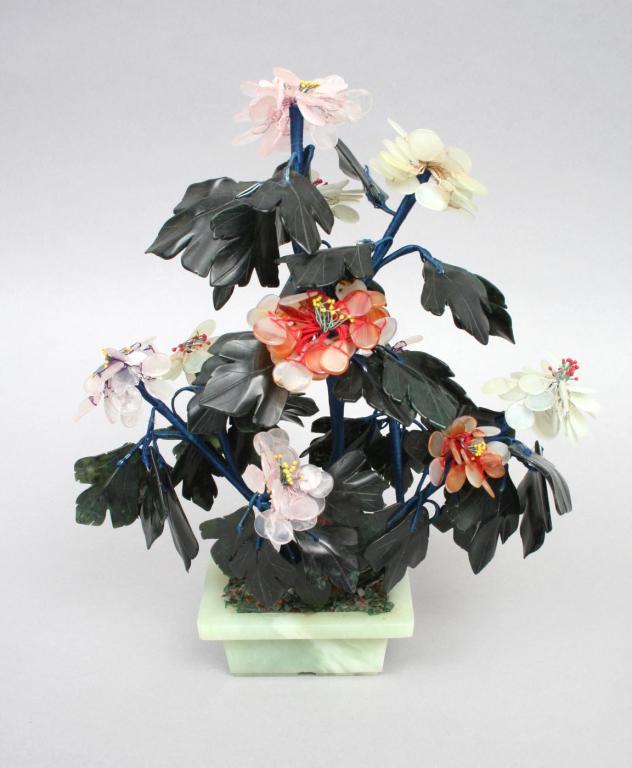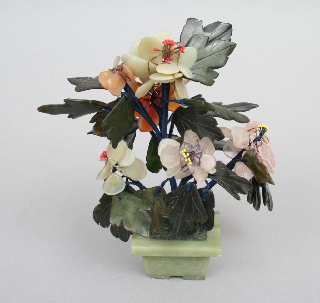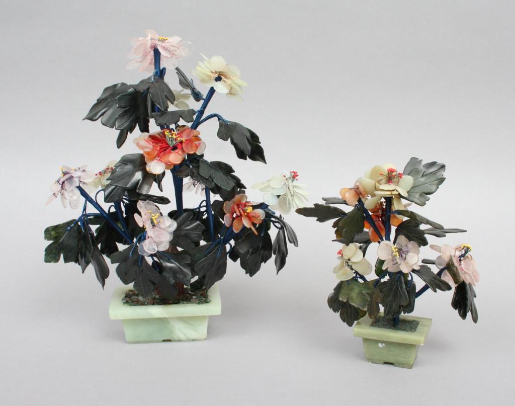 Comprising two vintage Chinese jade trees, each with flowers and leaves constructed of hard stone, including quartz and jade, raised on carved jade type bases. Larger 12 1/2"H. Smaller 7 3/4"H. Condition: very good, some light surface imperfections and tiny losses to hard stone.