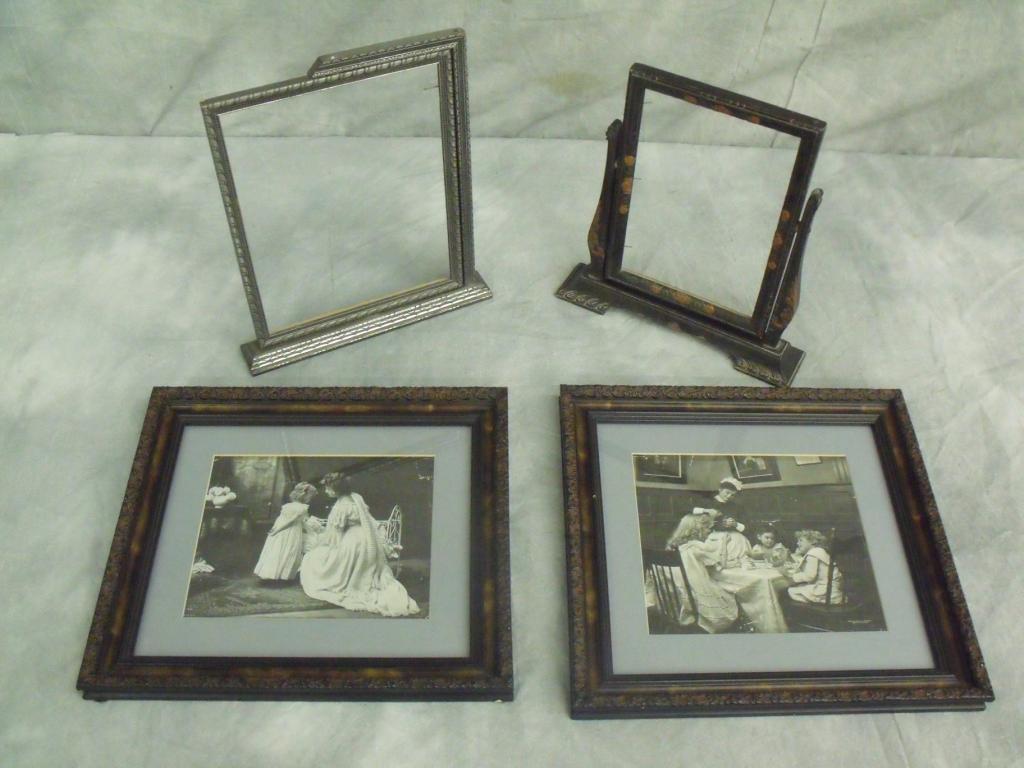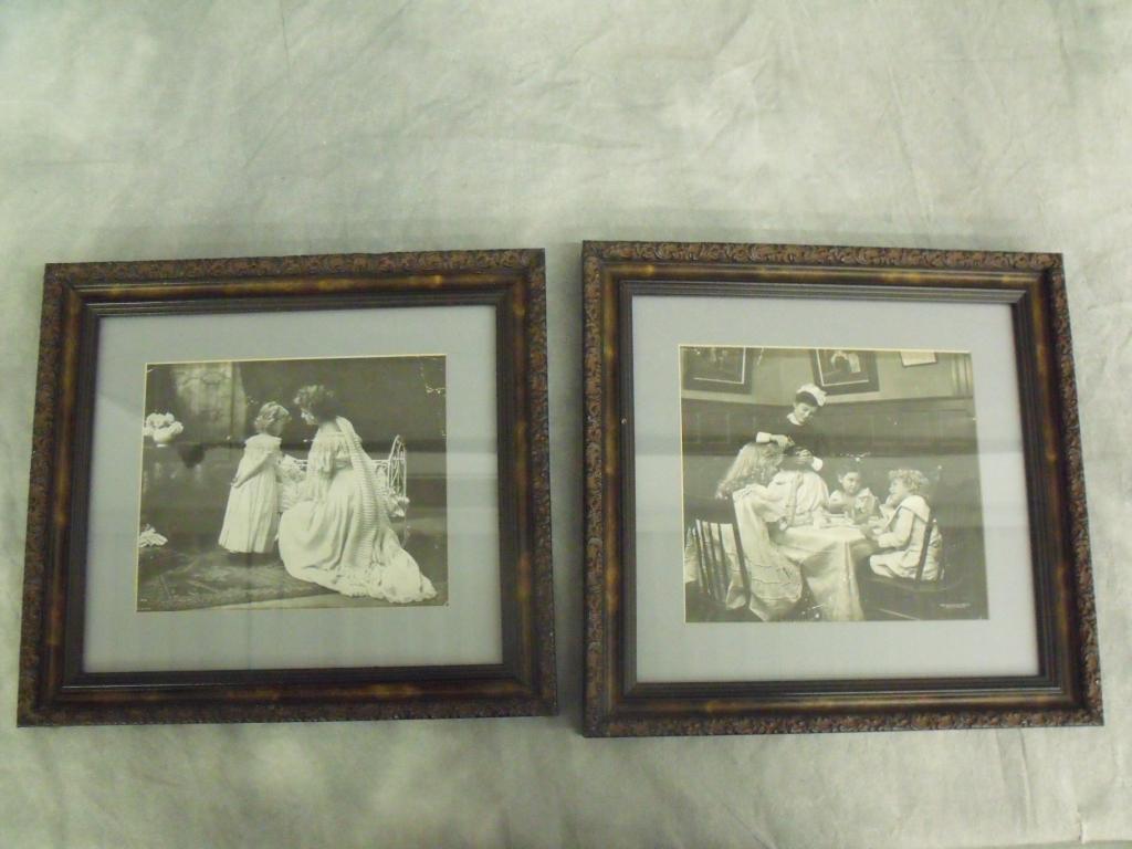 Two beautifull framed prints of photographs one is by AL Swift Co entitled "Sisters" the other is a Duo Platinum Co print entitled "Breakfast" Both prints are 8"x7". Two ornate vintage wood frames both swivel, one with orange floral pattern