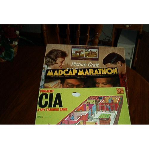 </font></strong>Featuring two games and one paint by number. The first game is called: PROTECT CIA. (A SPY TRAING GAME). For 3-4 players. Age 8 to Adult-Made in Canada-Stock #941. House of Games-Weddingtons. Copywrite 1974. The gameboard and pieces are in excellent condition. The second game is called: MADCAP MARATHON-Made by TOMY. NO. 7085-Four Different games in one-Ages 6 and up. Timer still works and the wooden marbles are still in excellent condition. C.1981. TOMY CORP. 901 E., 233rd St. Carson, CA., 90745. Confirms to safety standard PS72-76. The third item pictured is a paint by number set. Two matched 12" x 16" Artists' Panels-The Pictures-Craft Corporation/Division of the Drafting Company/Cleveland, OHIO-Series No. 300-Copywrite 1962. One of the panels (Both Horses) has been painted completely. The other one is partially completed. Bottles of paint are still included. Printed in U.S.A. (This one is listed as in Fair Condition}. The other two games are listed in excellent condition.</font>