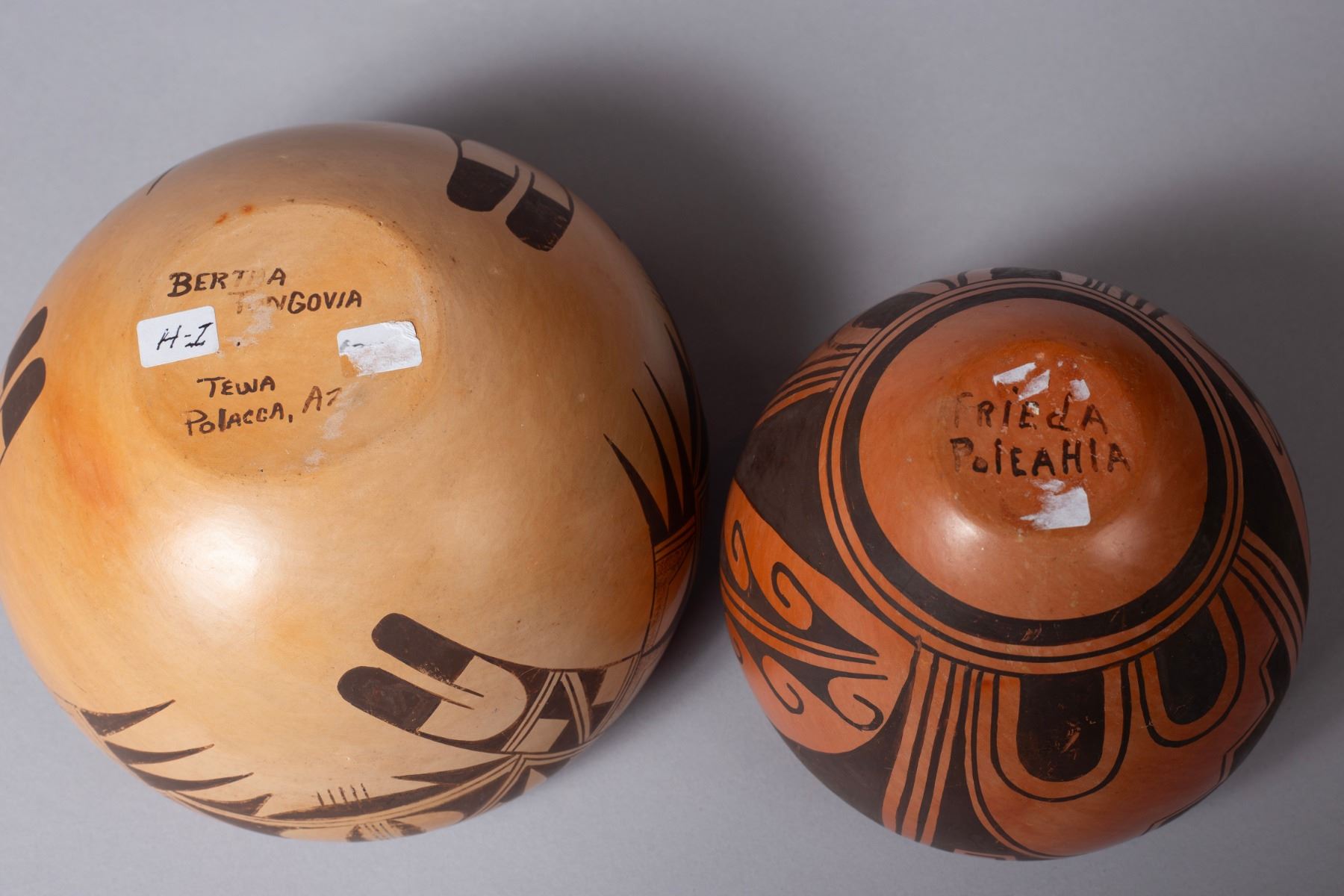 A captivating pair of vintage Hopi polychrome pots, representing the distinguished work of tow notable Native American potters: Bertha Tongovia and Frieda Poleahla. Each pot showcases hand-coiled and hand-painted traditional artistry for which Hopi pottery is renowned.