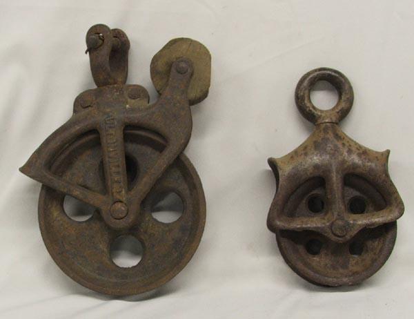 Two Vintage Metal Pulleys, largest measures approx. 11'' x 9''. SHI $30.