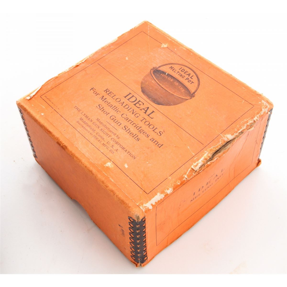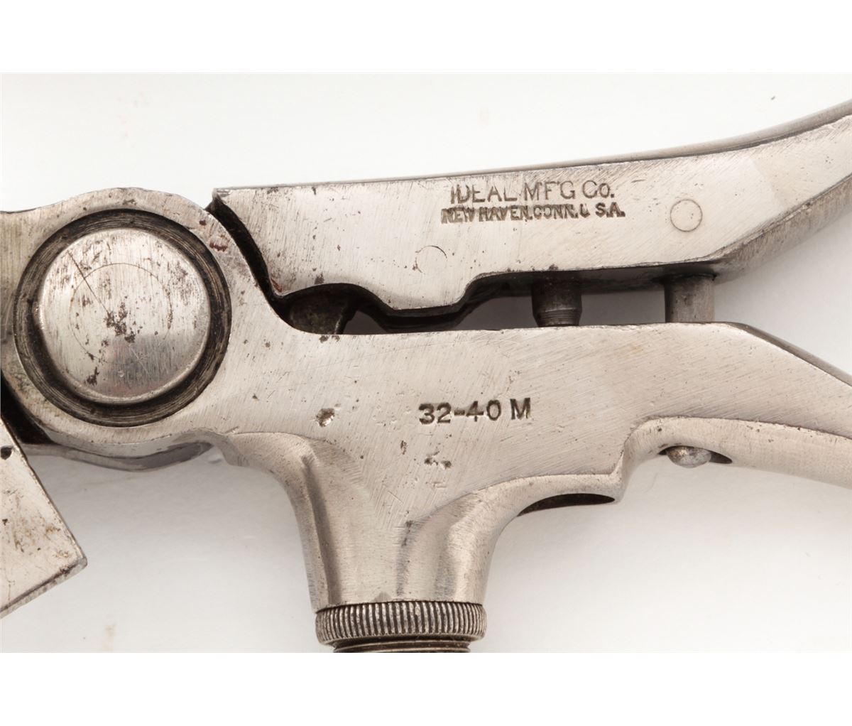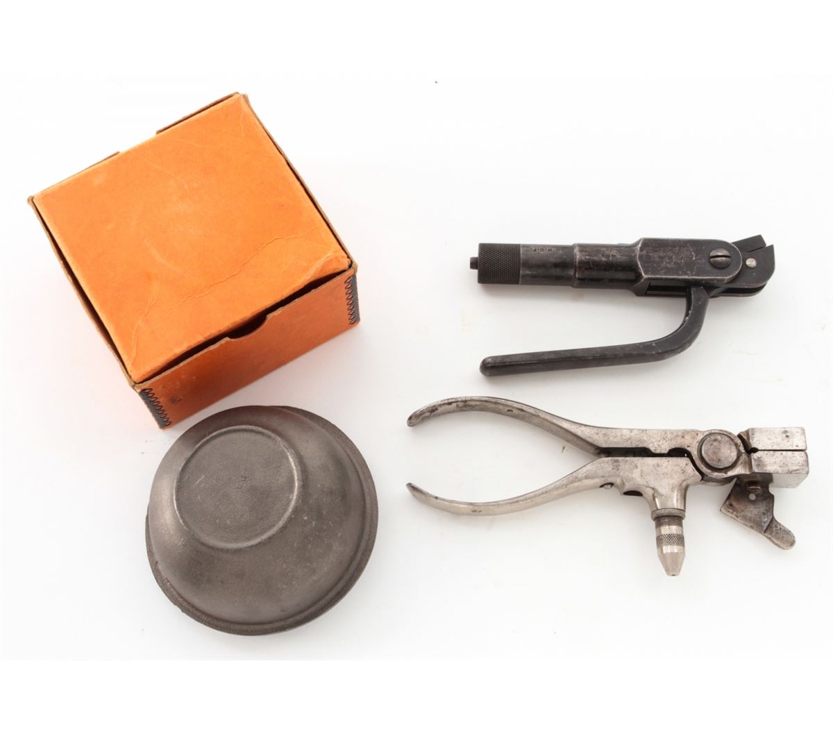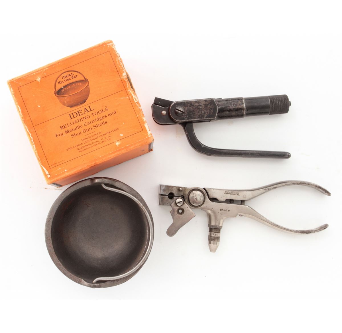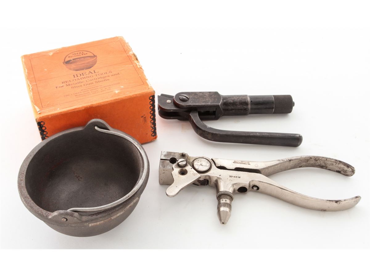 Lot of Two (2) Vintage Reloading Tools: (1) Ideal Mfg. Co. .32-40 M Reloading Tool with decapping pin. Condition is good showing some finish loss but good bullet cavity. (2) Winchester Rep. Arms. Co., New Haven, CT, Model 1894 .30 WCF Reloading Tool, marked ''Pat. February 13, 1894''. Condition is good showing use and approx. 65% finish remaining. Along with a Lyman Ideal Melting Pot, in original orange box. Box to melting pot is good with tatters and breaks to edges; label remains bright. Est.: $250-$350/lot.