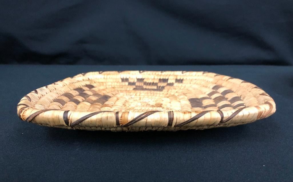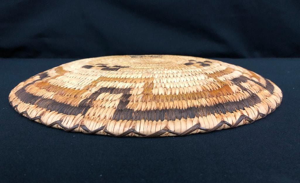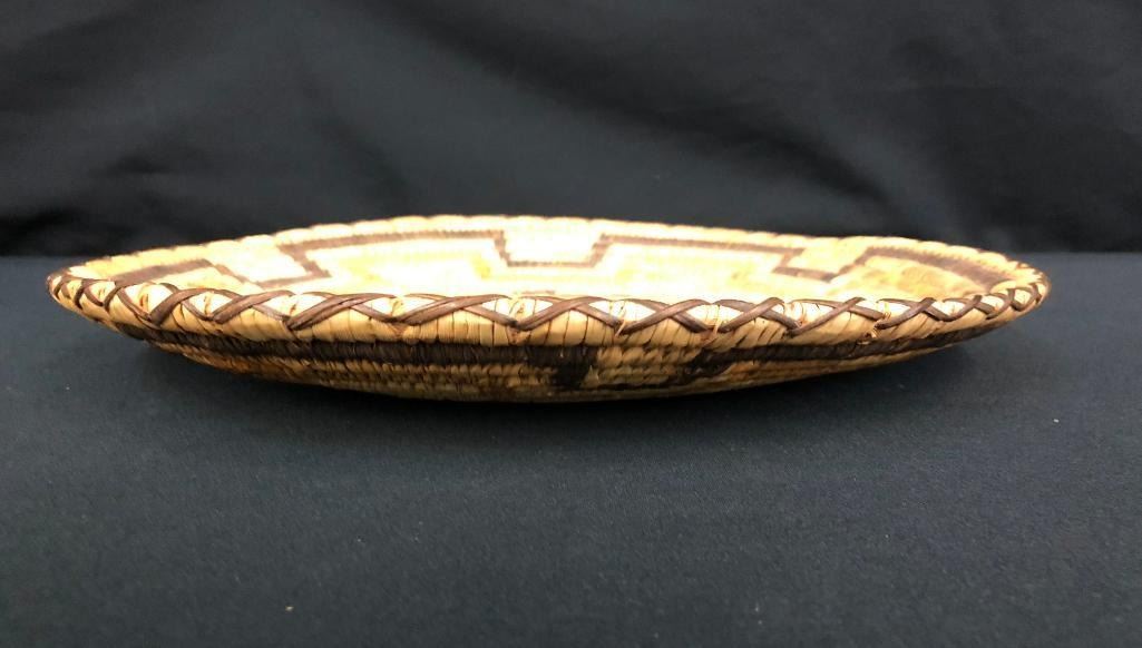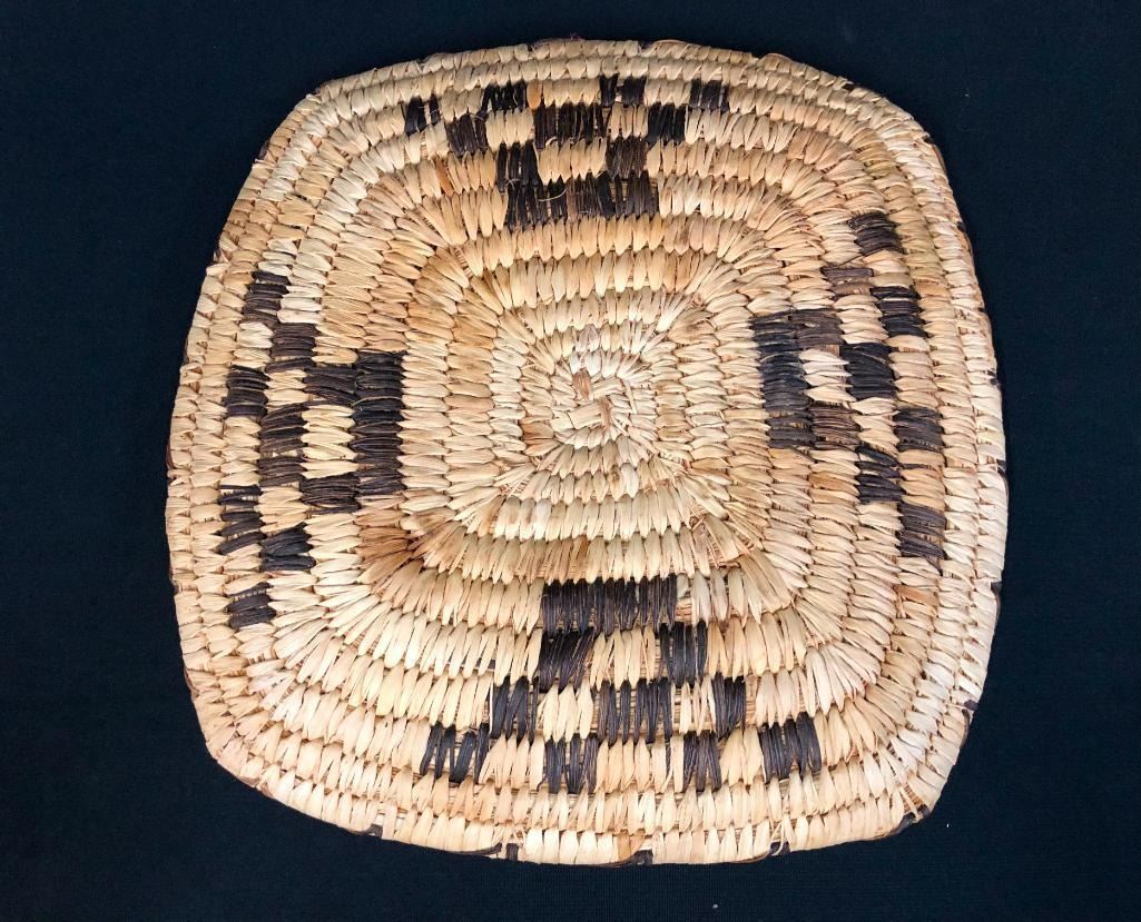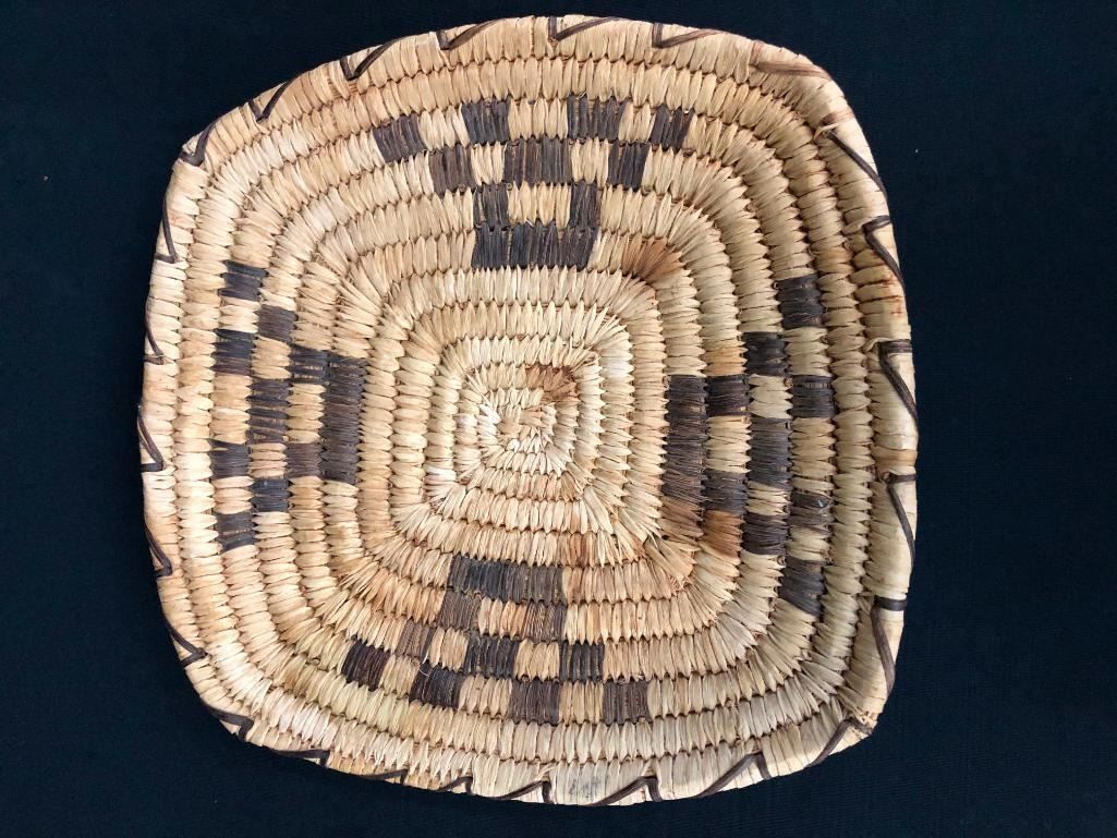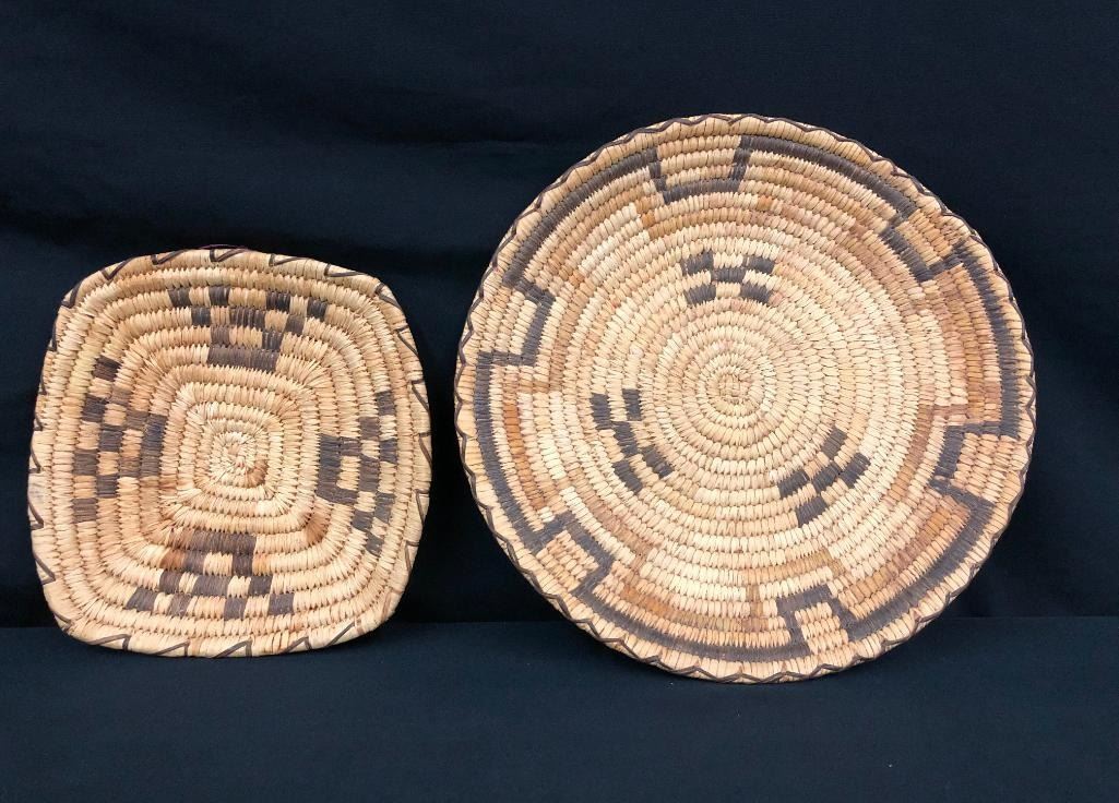 Offered for sale in this lot are two vintage Tohono O'Odham closed stitch baskets with designs. Each features geometric patterns and one is more of a round shape while the other more a square. These two baskets would make nice display items and a great addition to your collection. MAKER: Unknown Tohono O'Odham artists. APPROX AGE: Vintage SIZE: 9-3/8 inches wide X 1 inch deep. 13 inches wide X 1-1/4 inches deep. CONDITION: Pretty good for their ages, some wear and fading expected. Please look closely at the pictures as they are an important part of our description and are hereby incorporated into the description, specifically with regards to condition. SHIPPING: There will be a $8 handling / packaging fee for shipping this lot. The actual cost of postage will be added on top of that. BUY IT NOW: If you would like to buy this item now, without waiting for the auction day to bid on it, we do offer this option (which is available up to 48 hours before the actual auction starts). The “Buy it Now†price is the high estimate of this lot (plus applicable fees and the Buyer's premium you pay is discounted to only 10% when using the Buy it Now option). If you would like to exercise this option, you must contact us by email (or phone as long as you talk to someone live). Reference this lot number and your intention to "Buy it Now."
