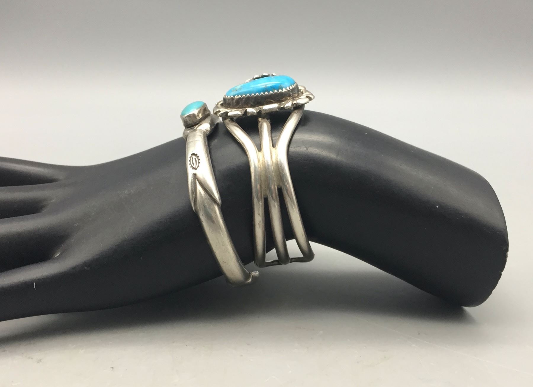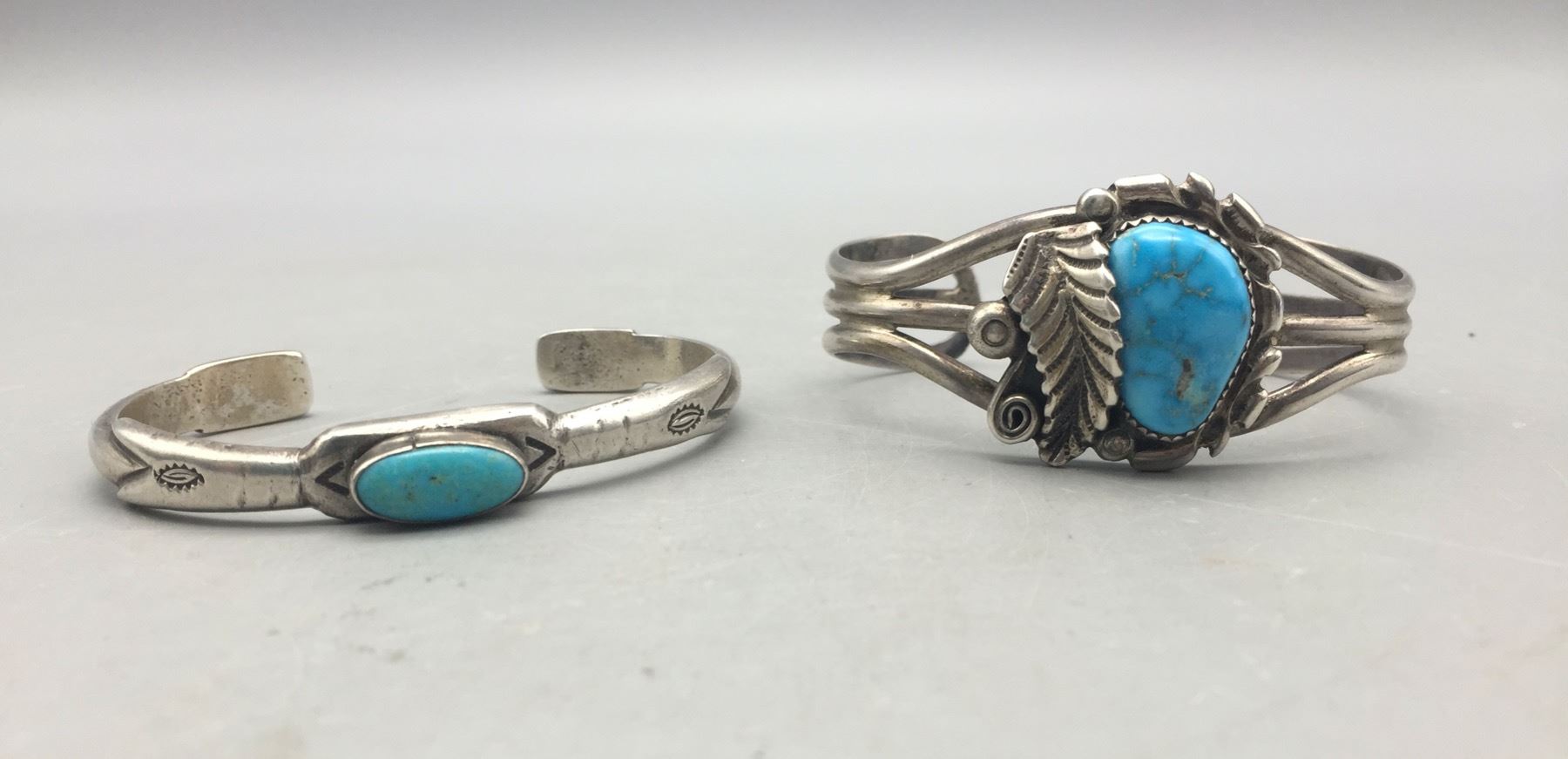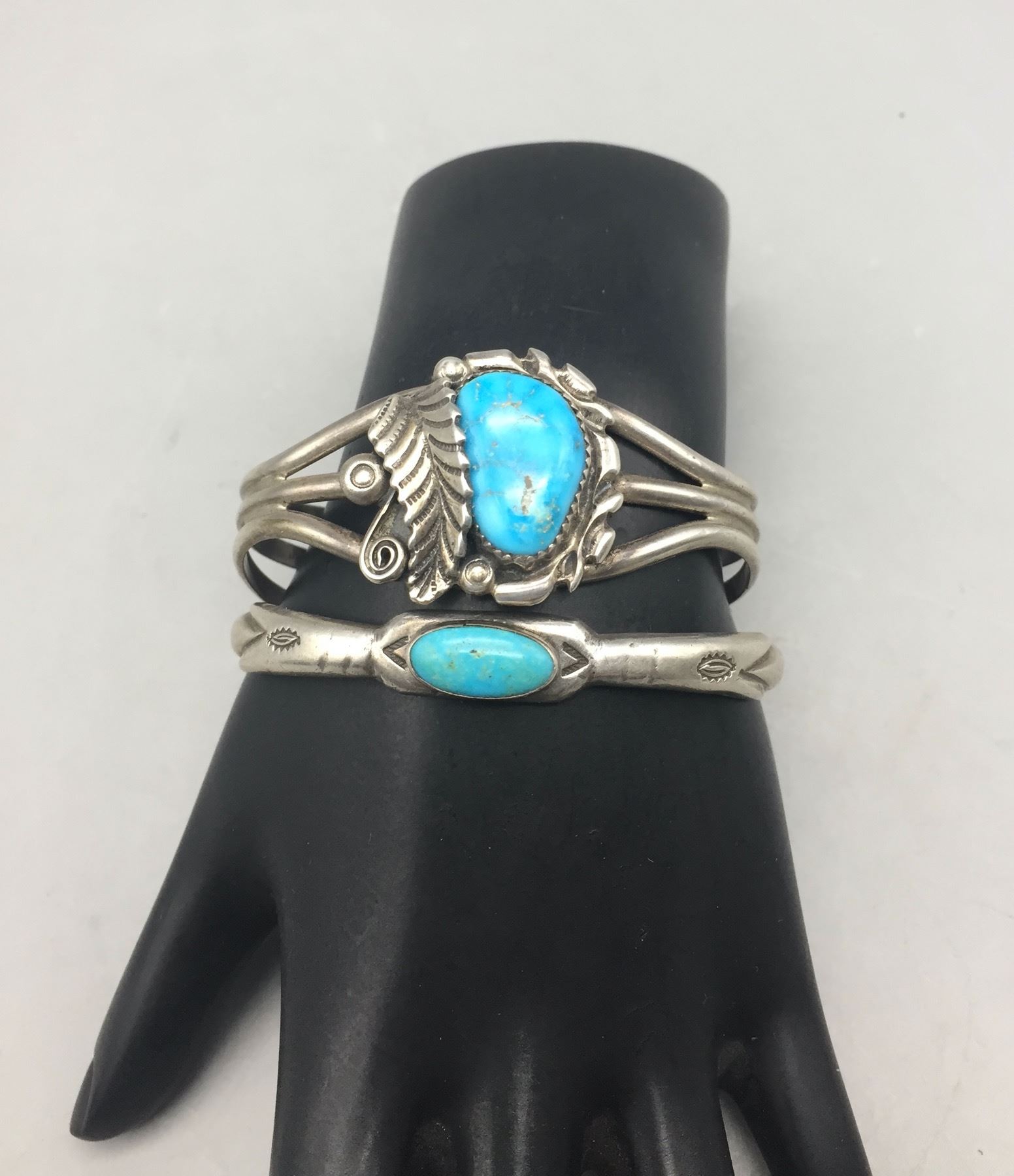Description: Offered for sale in this lot are two vintage turquoise bracelets. Each is sterling silver. Take a look! Maker: Various. Approx. Age: Vintage. Size: Various. Combined weight is 56.2 grams. Condition: Good for their ages, normal wear expected. Please look closely at the pictures - they are an important part of our description. Shipping: There will be a $5 handling, packaging fee for shipping this lot. The actual cost of postage will be added on top of that.
