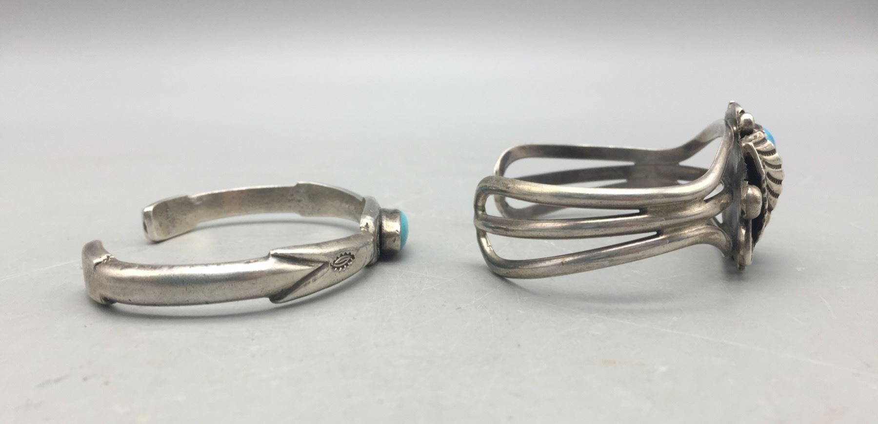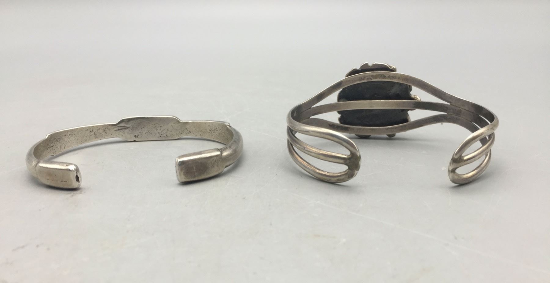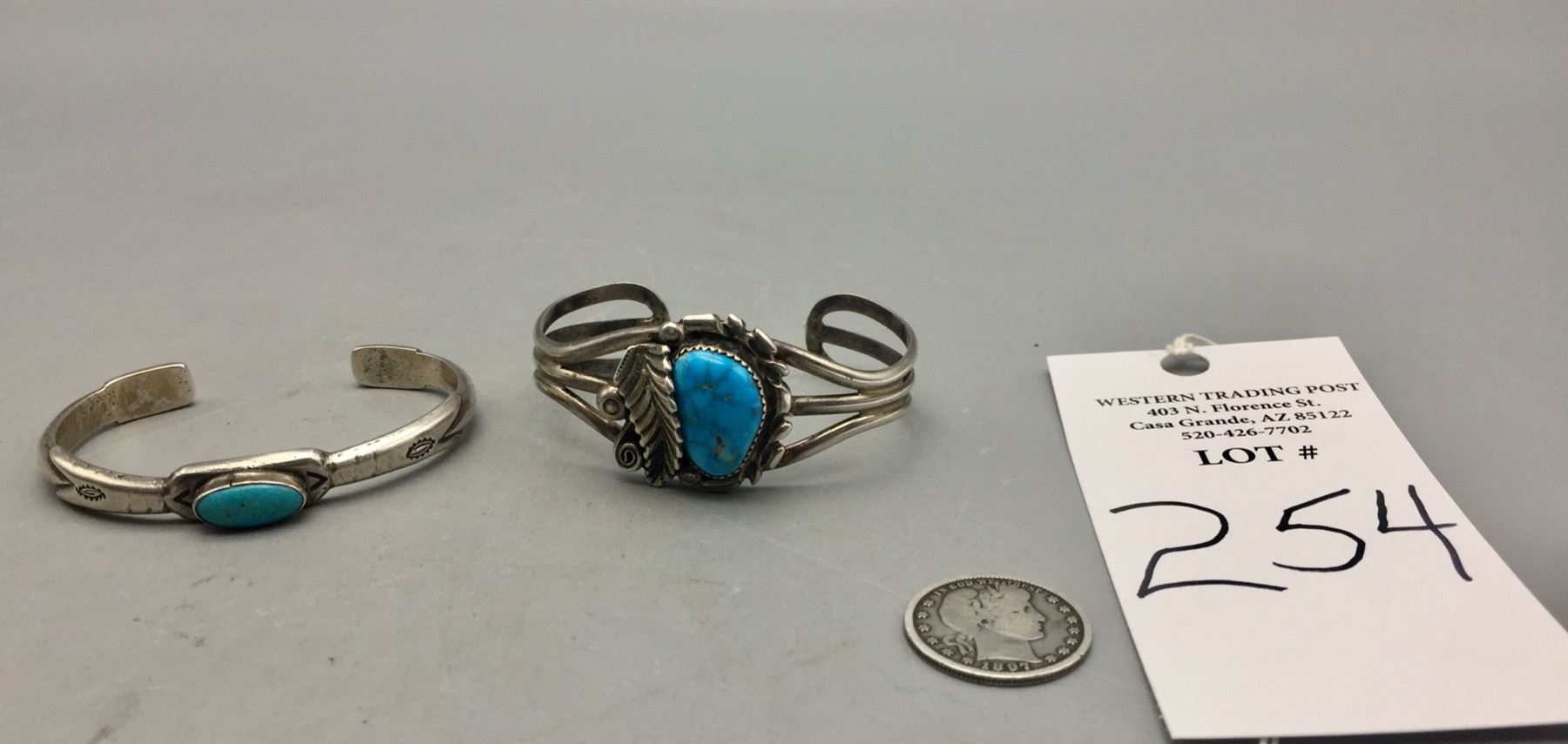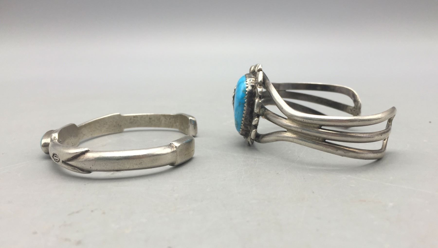Description: Offered for sale in this lot are two vintage turquoise bracelets. Each is sterling silver. Take a look! Maker: Various. Approx. Age: Vintage. Size: Various. Combined weight is 56.2 grams. Condition: Good for their ages, normal wear expected. Please look closely at the pictures - they are an important part of our description. Shipping: There will be a $5 handling, packaging fee for shipping this lot. The actual cost of postage will be added on top of that.