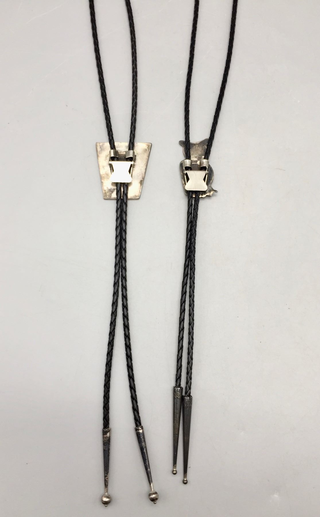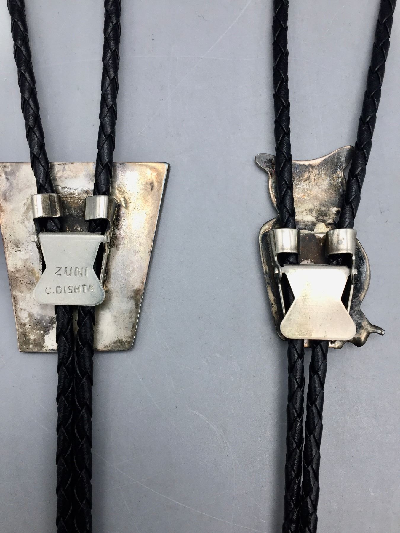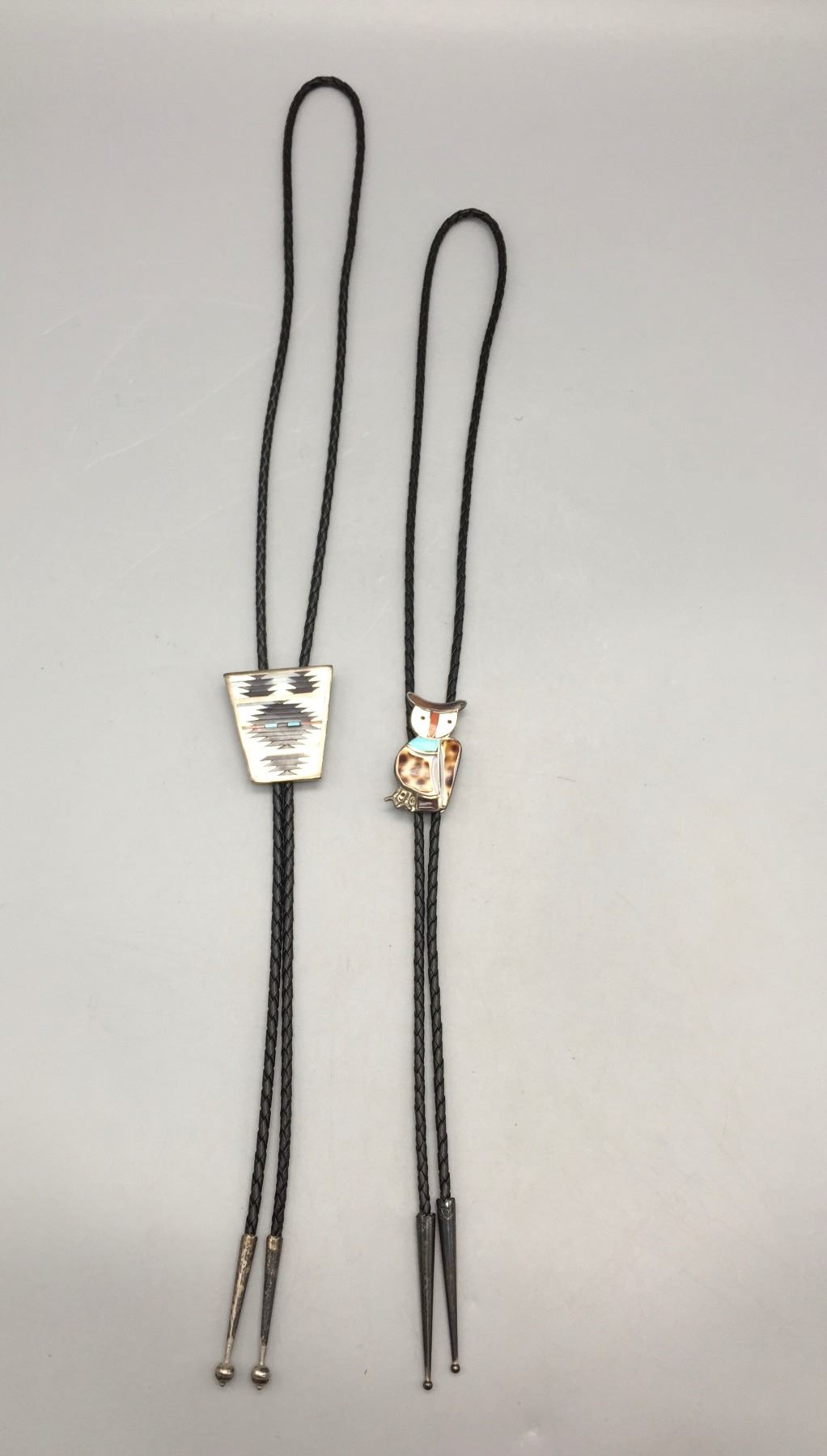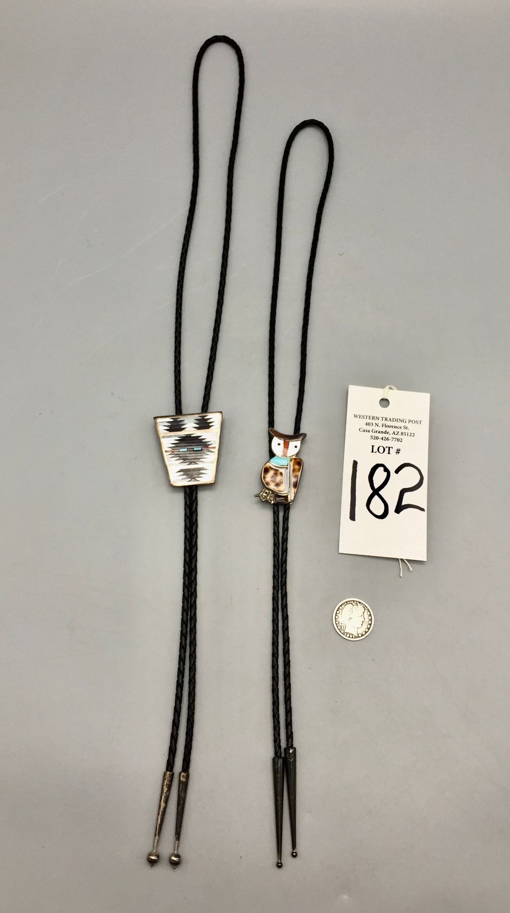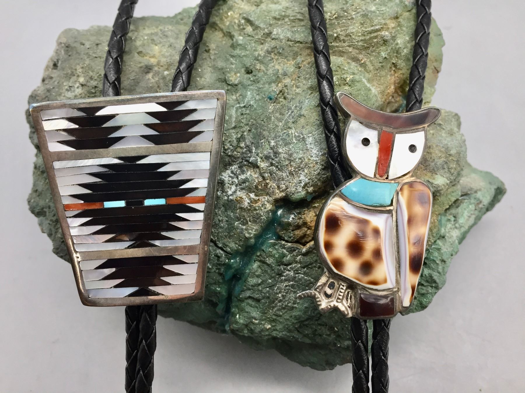 Description: Featured for sale in this lot are two vintage Zuni bolos. One features an inlay design of an owl and the other is an abstract design. Both are on black braided cord with sterling silver tips. Maker: Various Zuni artists. Approx. Age: Vintage. Size: Fits a 44” neck and fits a 38” neck. Condition: Good for their age, normal wear expected. Please look closely at the pictures - they are an important part of our description. Shipping: There will be a $5 handling / packaging fee for shipping this lot. The actual cost of postage will be added on top of that.