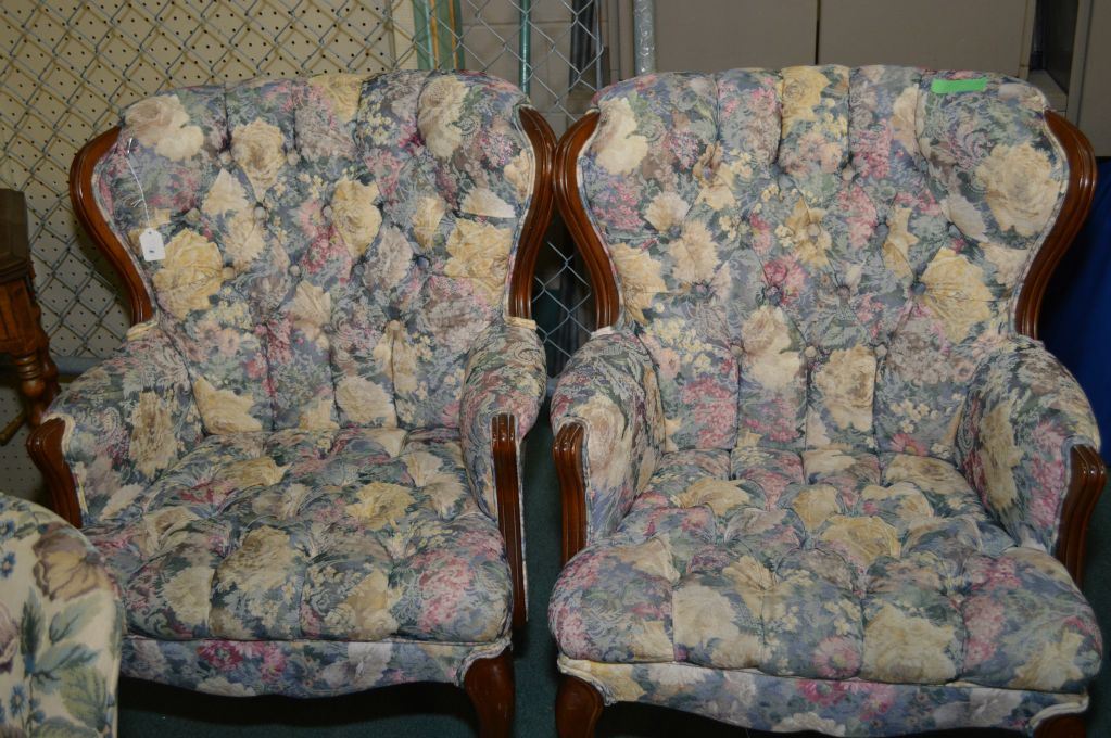 Two Vintage button tufted floral upholstered lady's wingback chairs