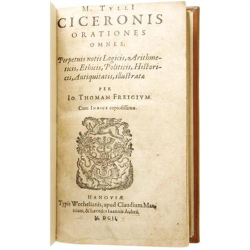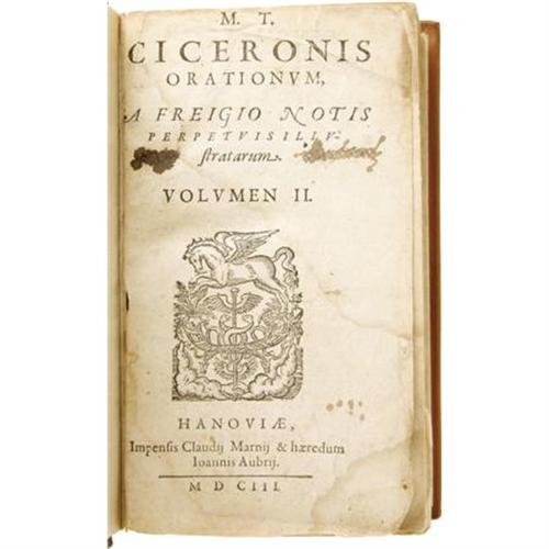 <B>Two Volumes of Cicero,</B></I> including:<BR><B><I>Ciceronis Orationes Omnes</B></I></B></I> (Hanover: Typis Wechelianis, 1602), 777 pages plus Index, modern brown leather binding with gilt spine titles, 12mo (4.5" x 7.25"). Very good condition. and,<BR><B><I>Ciceronis Orationum</B></I></B></I> (Hanover: Typis Wechelianis, 1602), 776 pages plus Index, modern brown leather binding with gilt spine titles, 12mo (4.5" x 7.25"). Very good condition.<BR><BR><b>Shipping:</b> Books & Catalogs (<a target="_blank" href="http://www.heritageauctions.com/common/shipping.php">view shipping information</a>)
