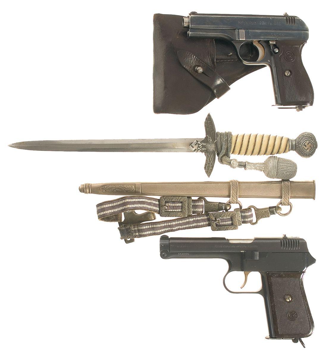 A) Fixed sights and standard features, with "WaA76" proof, checkered grips with commercial leather holster with only "eagle/ swastika/ M" proof and extra magazine. With a Luftwaffe dagger, no makers marks, with white celluloid grip, silver wire portapee, sheath and gray hanger with square buckles.