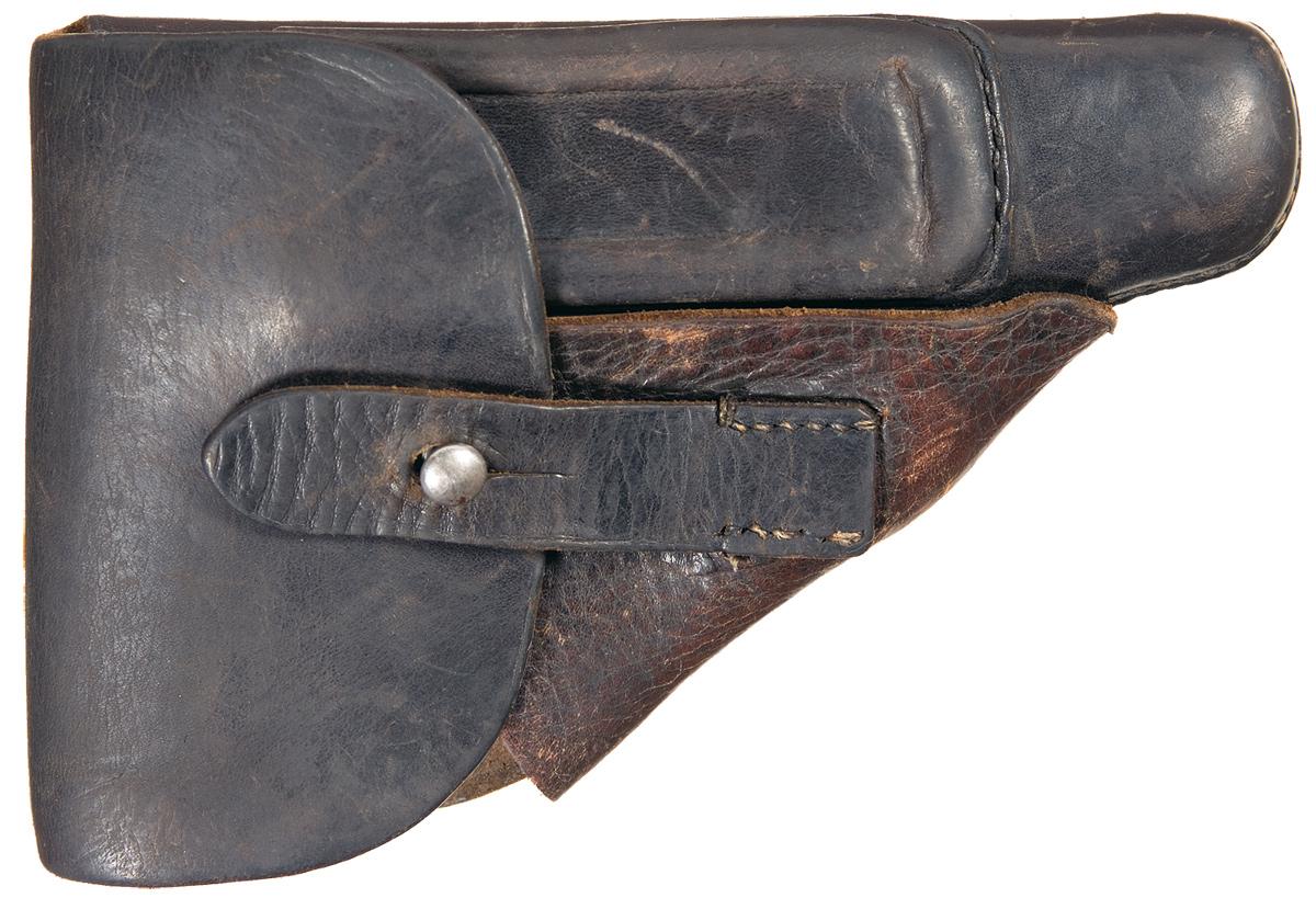 Condition: Excellent. The pistol retains 90% original blue finish with some minor edge wear. The backstrap has a smooth gray patina and a few minor scratches, with the front grip strap thinning to a brown patina. There is a hairline crack on the bottom of the right grip panel, otherwise the grips are excellent with a few minor handling marks. The checkering is crisp. Mechanically fine. The holster is very good with some absent stitching on the belt loop and some minor flex wear.