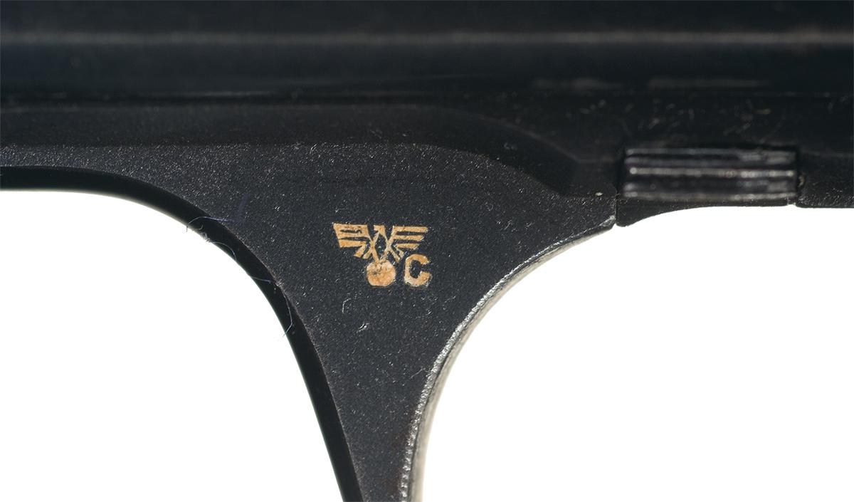 The pistol has the two line left slide logo ("J.P. SAUER & SOHN SUHL / CAL 7,65") and right slide marked "PATENT". Single "eagle/N" commercial proofs on the right slide of slide, barrel near the muzzle, and frame under the serial number. The clear "eagle/C" police acceptance stamp is located on the left trigger guard web. Magazine numbered to gun with a base stamped with the caliber marking and intertwined SS. Standard grips. Complete with an unmarked leather holster.