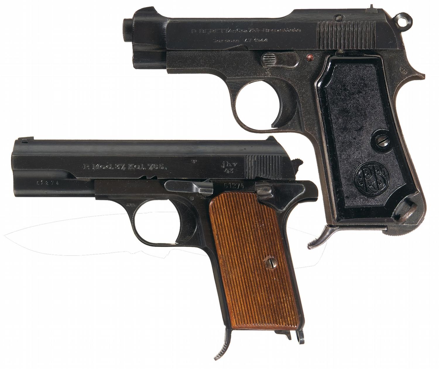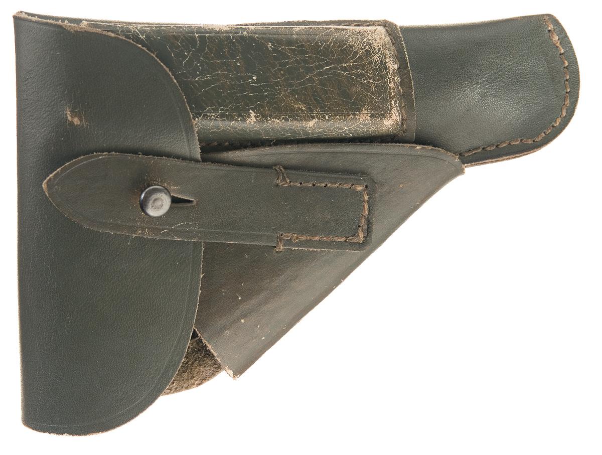 A) This pistol has the German occupation slide legend: "P. BERETTA-CAL. 7.65-BREVETTATA / GARDONE V.T. 1944". The left grip tang has the "4 / UT" German acceptance quality control marking. Fitted with metal backed plastic grips with "PB" emblem. Complete with an unmarked green leather holster.