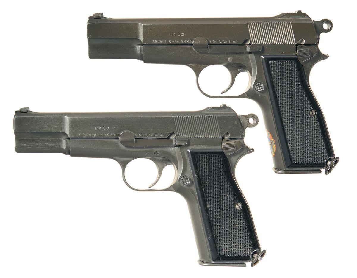 A) Fixed sights, smooth backstrap, maple leaf emblem on frontstrap, crossed pennants and Canadian "broad arrow in C" proofs, matching numbers and checkered grips.