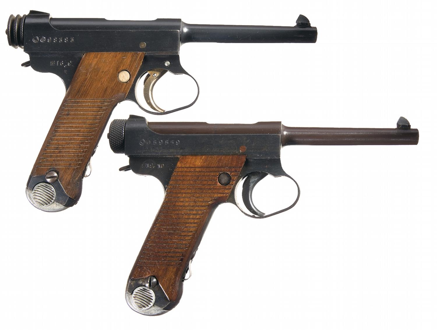 A) Dated September 1941(Showa 16.9), with the late style enlarged trigger guard, external magazine safety spring, grooved and knurled cocking knob, straw finished trigger and safety, and serrated wood grips. Matching numbers including the nickel magazine.