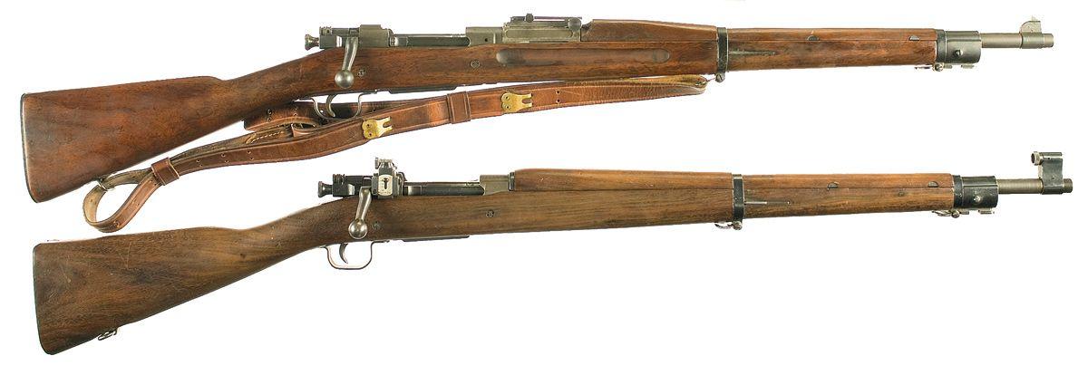 B) Top barrel marked "RA/bomb/8-43" fitted with raised globe front and rear receiver ring drilled, tapped, and filled with Lyman micrometer rear peep sights. Complete with circled "P" proof behind trigger guard, "RA", "FJA" and Ordnance inspection cartouches on left wrist area.