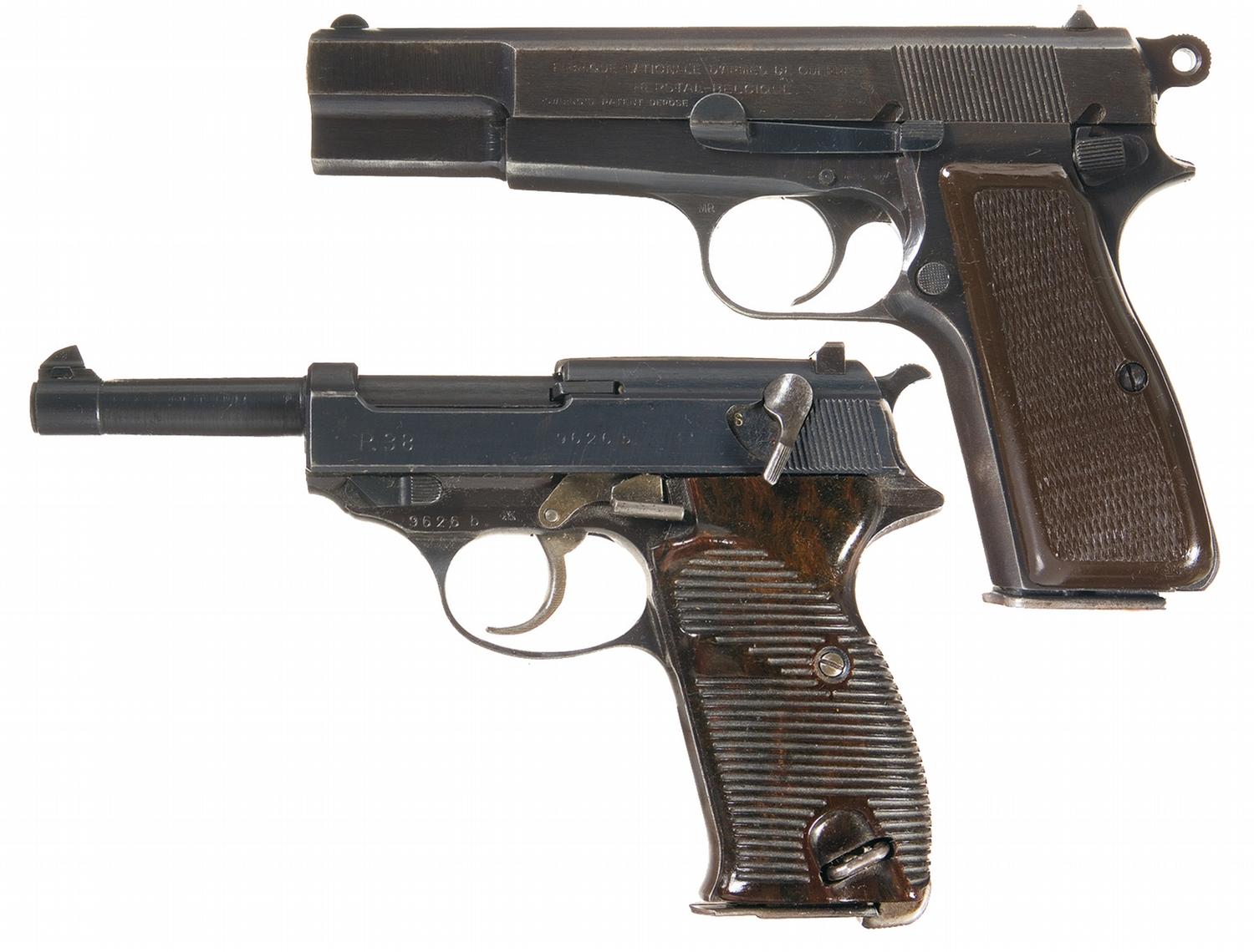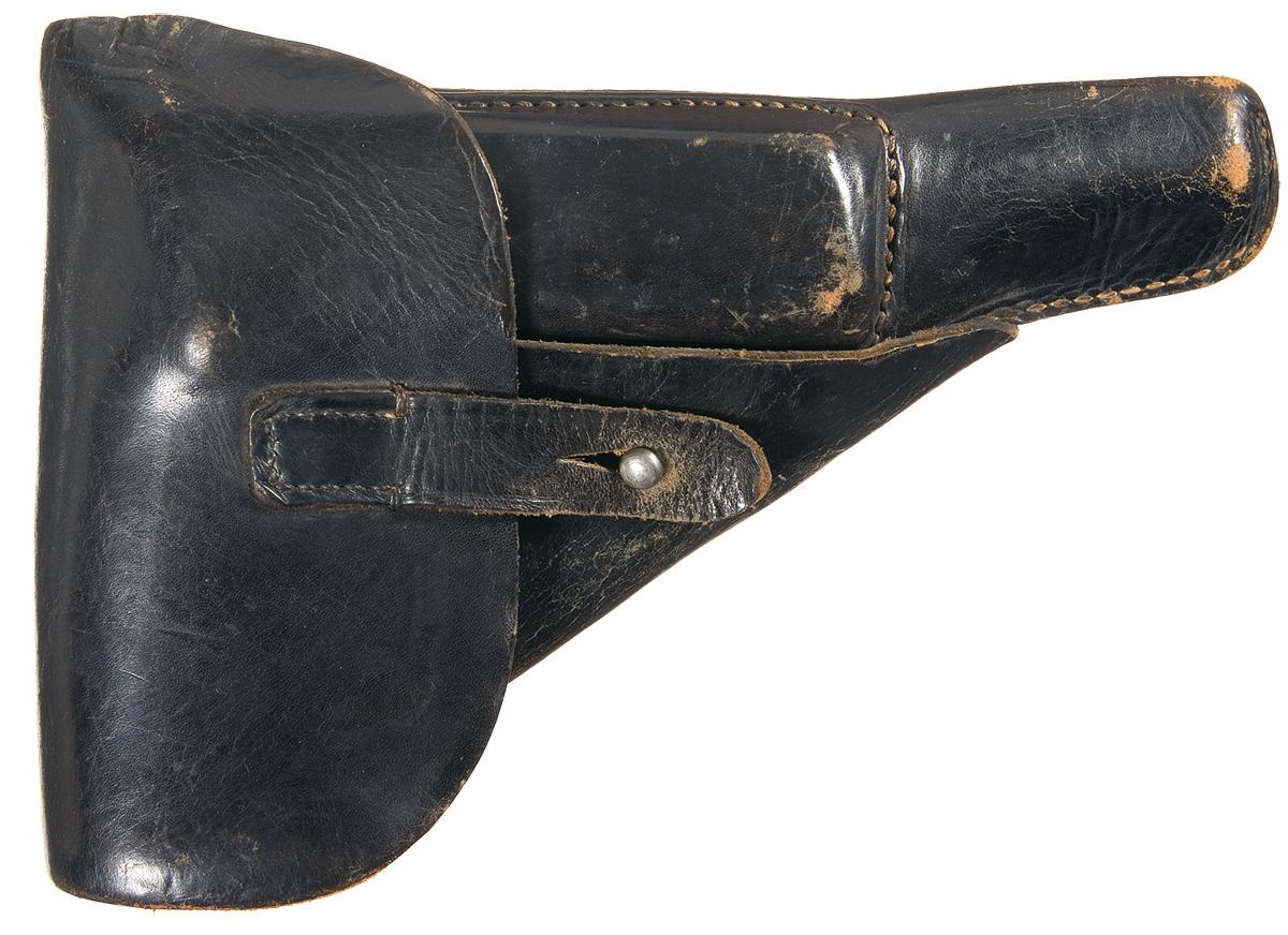 Fixed sights, with the "ac 45" inline code and date markings on the left side of the slide, "eagle/ 359" and "eagle/ swastika" proofs on the right, the "359" repeated on the frame and locking block, and the "fnh" coded barrel proofed "WaA16". Grips are ribbed brown plastic. With a black leather flap holster marked "fkx/ 4" (Gustav Sudbrack, Bielefeld) on the back, with spare magazine.