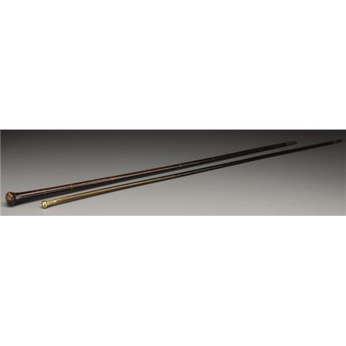 <B>Two Walking Sticks Owned by Confederate Captain Anthony Wayne Caldwell - Killed at the Battle of Atlanta.</B></I> Captain Anthony Wayne Caldwell enlisted with Company "B" of the 5th Tennessee Infantry at Paris, Tennessee at the start of the Civil War, joining the service of the Confederacy as did his three brothers. Only his brother, Confederate Surgeon Samuel Houston Caldwell, would survive the war. Captain Anthony Wayne Caldwell would die of wounds he received at the Battle of Atlanta in July 1864. <BR><BR>These two walking sticks were owned by Captain Caldwell and left at home back in Paris, Tennessee. The first was made at the Tennessee State Penitentiary by the inmates of that institution. The warden of the facility was a friend of the Caldwell family. It is of an unusual, almost folk art design as it is made of tightly-wound leather washers fitted around a central iron rod. At 34” in length it includes a 1½” brass tip at the end. With a rounded knob as a handle, it is very sturdy and quite useable today. <BR><BR>The second walking stick is a thinner stick made of wood and at 36½” is somewhat longer than the first with a 1” brass tip. The handle is made of gold fitted to the wood and is engraved in an ornate foliate design and measures 1¼”. These two walking sticks are personal artifacts owned by a brave Confederate captain who never made it home from the war.<BR><BR><b>Shipping:</b> Bats, Clubs, Sticks, Swords, Rif (<a target="_blank" href="http://www.heritageauctions.com/common/shipping.php">view shipping information</a>)