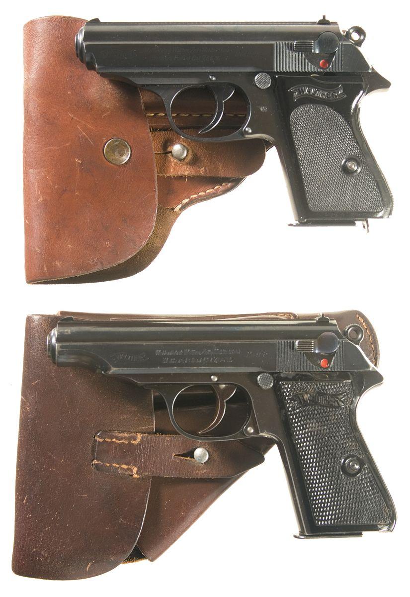 A) Standard features, with matching numbers, "eagle/ swastika C" police stamp on frame, checkered grips and unmarked brown leather holster.