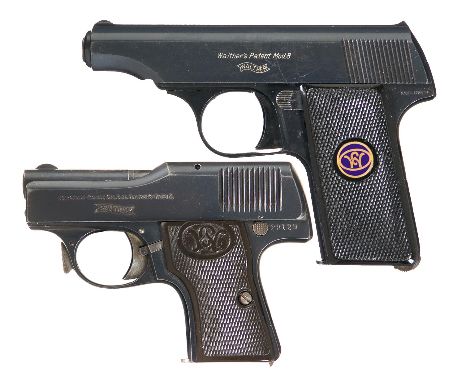Introduced in 1908. The right rear of the barrel is marked with two "crown/N" proofs and the right side of the slide is marked with one, and the left side of the slide is marked "SELBSTLADE - PISTOLE CAL 6.35. WALTHER'S PATENT." over the heavily struck Walther Banner. Unmarked nickel magazine and checkered hard rubber grips with "CW" at the top.
