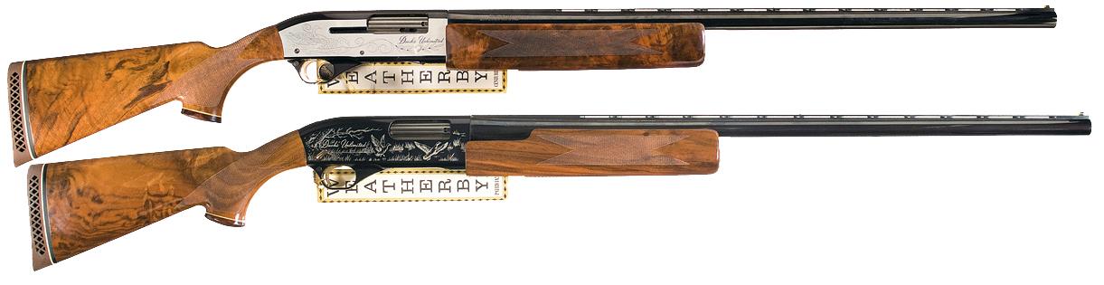 A) Manufactured in Japan. Double bead sights on a matte vent rib, with the barrel featuring a 2 3/4" magnum and 3" chambers, choked full. Fluted bolt and gold washed trigger. The flat sides of the receiver feature the Ducks Unlimited markings and are bright, with the remaining surfaces blue. Checkered forearm and pistol grip stock with contrasting grip cap featuring the Ducks Unlimited inlay and vented Weatherby recoil pad. Length of pull is 14". Complete with full length case and hanging tag.