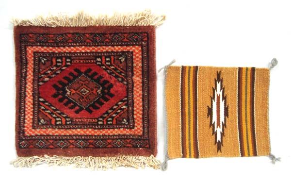 Two Weaving Samplers - Navajo and Persian. The Navajo weaving is light brown, dark brown and other earth tones and measures 9.25'' x 7.75''. The other is a Persian sampler and measures 11'' x 12''.