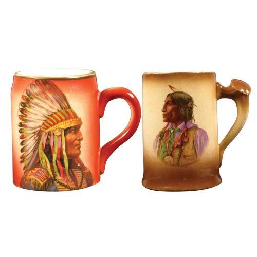 Two Mugs including a Porcelain miniature mug with painted Native American chief, 2 1/2 inches tall. And a Ceramic mug depicting Native American Indian, 5 inches tall. Both with No chips or cracks in excellent condition.