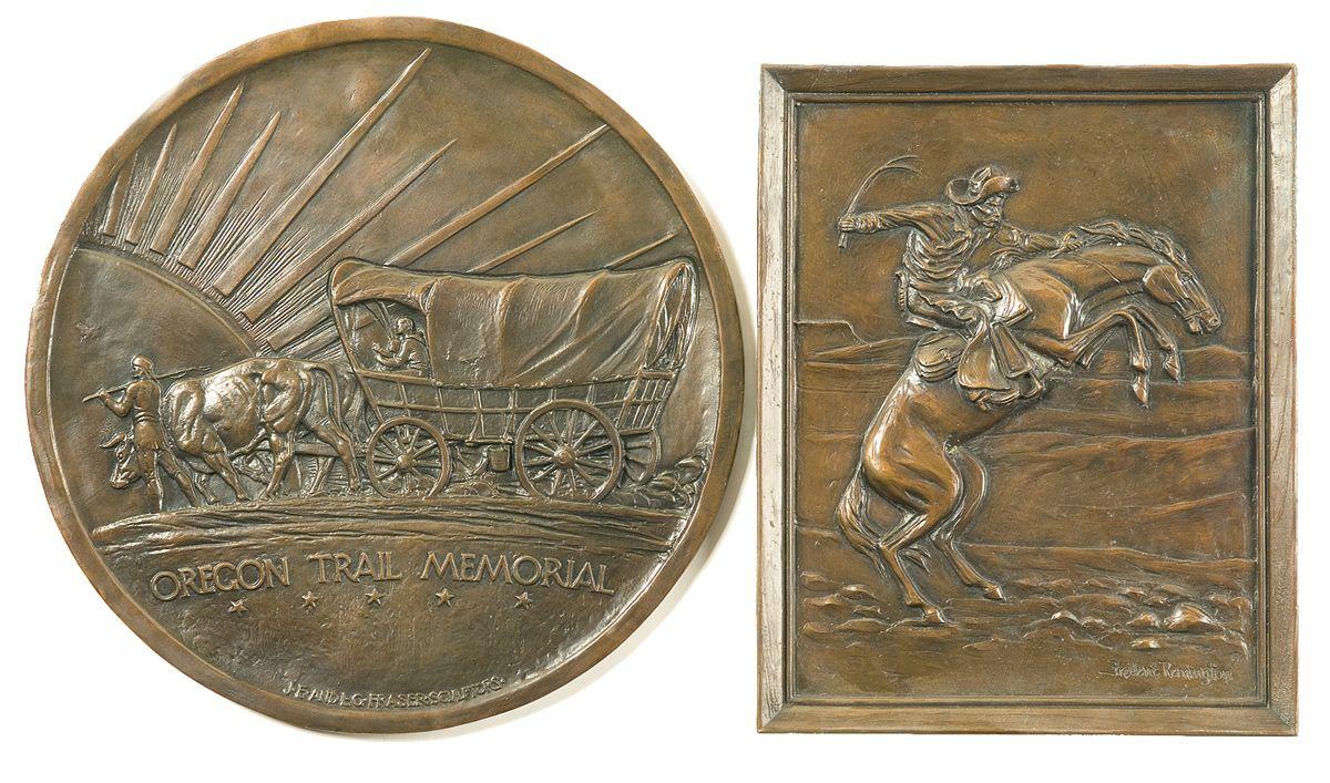 1) Oregon Trail by James Earle & Laura Fraser (Amer. 19/20th Cent). This great husband and wife sculpture commemorates the Western passage of the American people going out to seek their good fortune/ good life in Oregon. The oxen drawn wagon is being led by the husband while the wife is holding the reins of the wagon. The bright sun is in the foreground over the Plains they are heading towards. James Earle Fraser is known for the Legendary End Of The Trail Bronze & his wife for other monument statues. The Plaque is signed on the bottom "Fraser Sculptors". No foundry mark and measures 16 1/2" in diameter and weighs 9 Lbs. Very good condition. 2) Bronco Buster Bronze Plaque after Frederic Remington (Amer. 19/20th Cent). The fine cast bronze shows the famous image of the bronco buster cowboy being lifted by the bucking horse against a Western landscape with rolling hills. Signed Frederic Remington in the lower right corner. The plaque measures 12"x15" and weighs 20 Lbs. In very good condition.