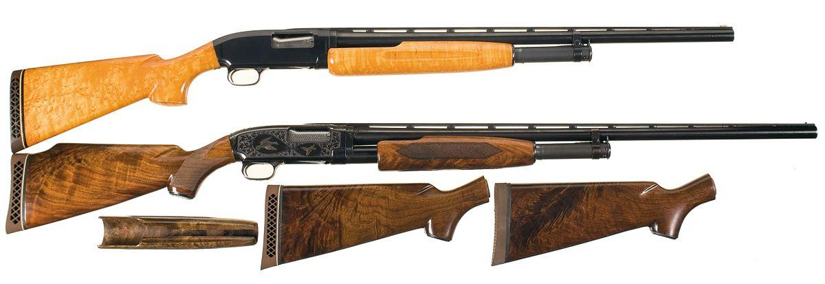 A) Standard markings with replacement custom maple buttstock and forearm. Complete with Pachmayr White Line vented recoil pad, original style walnut buttstock and forearm with Pachmayr White Line vented recoil pad. 2 3/4" chamber, cylinder choke with length of pull 13 7/8".