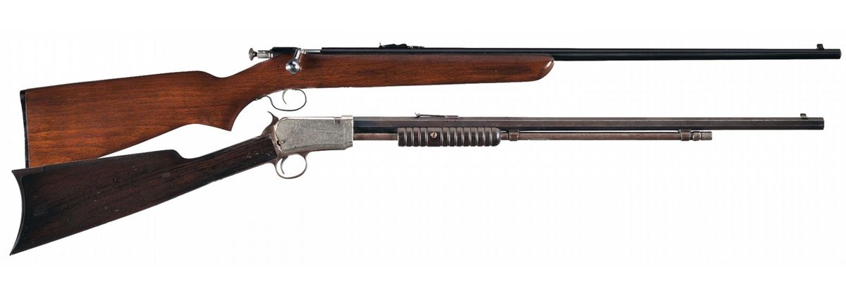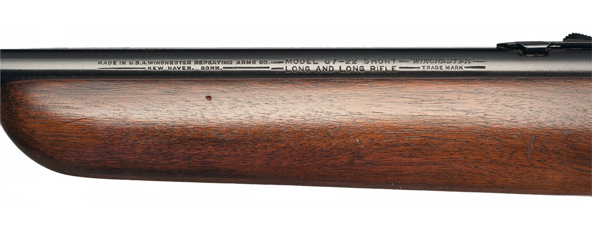 - B) Manufactured in 1919 as a Nickel Plated Winchester Model 1906 Expert Slide Action Rifle and subsequently rebarreled with a Winchester Model 1890 barrel with the 90-8 barrel markings, the Winchester proof and "ovaled P" proof. Beaded blade front sight and elevation adjustable rear sight. The trigger guard assembly has the serial number "332340" on the lower tang with "WINCHESTER/TRADE MARK" on the top tang. Mounted on a 12 groove round forearm and straight grip stock with curved steel buttplate.