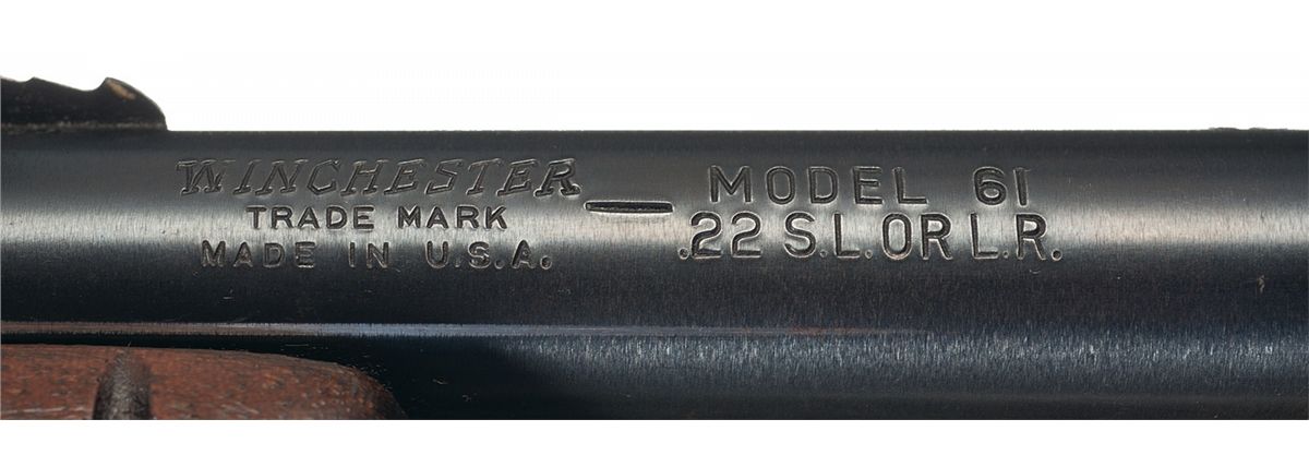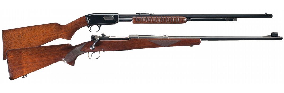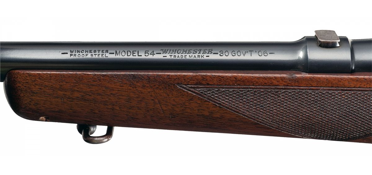 A) Manufactured in 1954 with a bead front sight and elevation adjustable rear sight. The left side of the receiver has four holes drilled and tapped with filler screws. Fitted with on a 17 groove flat bottom walnut forearm and smooth pistol grip stock with checkered steel buttplate.