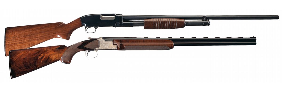 A) Manufactured in 1959 with a single steel bead sight, choke marked modified but gauges at cylinder and a 2 3/4 inch chamber. Mounted on a 11 groove walnut forearm and smooth pistol grip stock with checkered plastic buttplate. Length of pull is 14 inches.