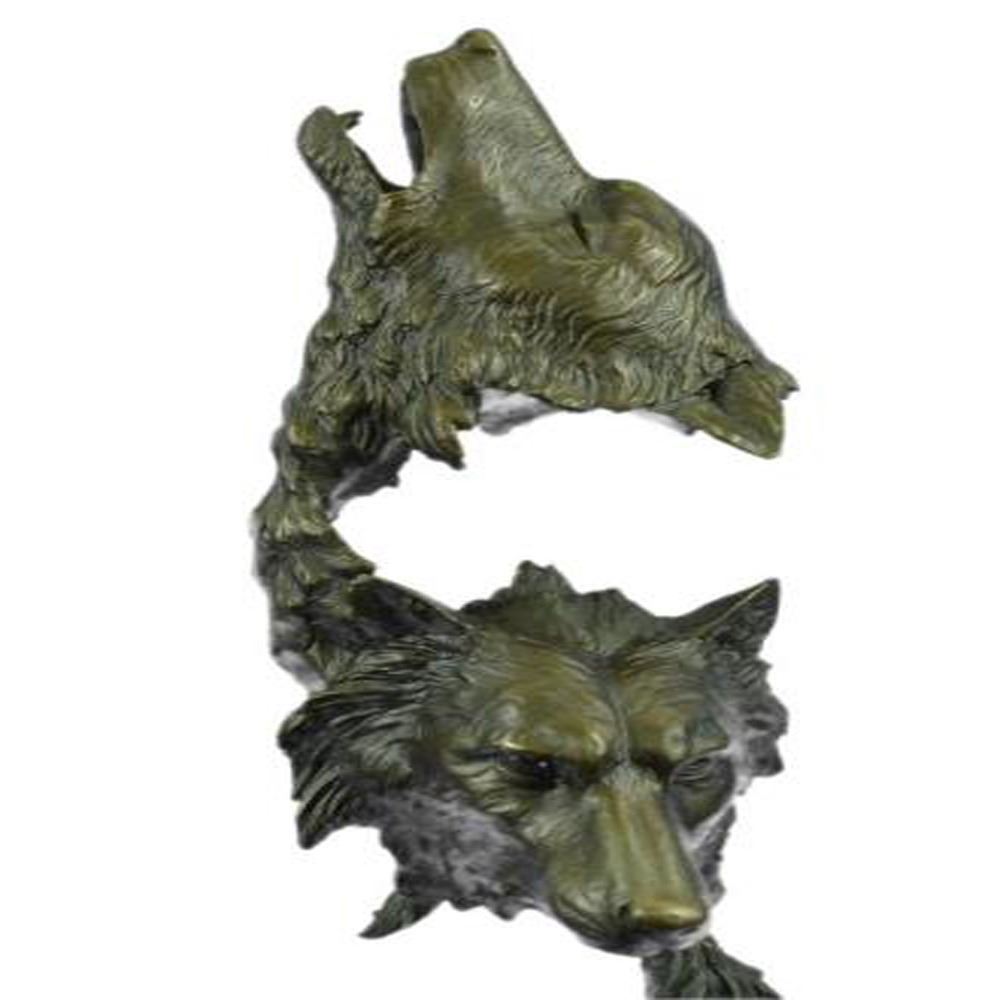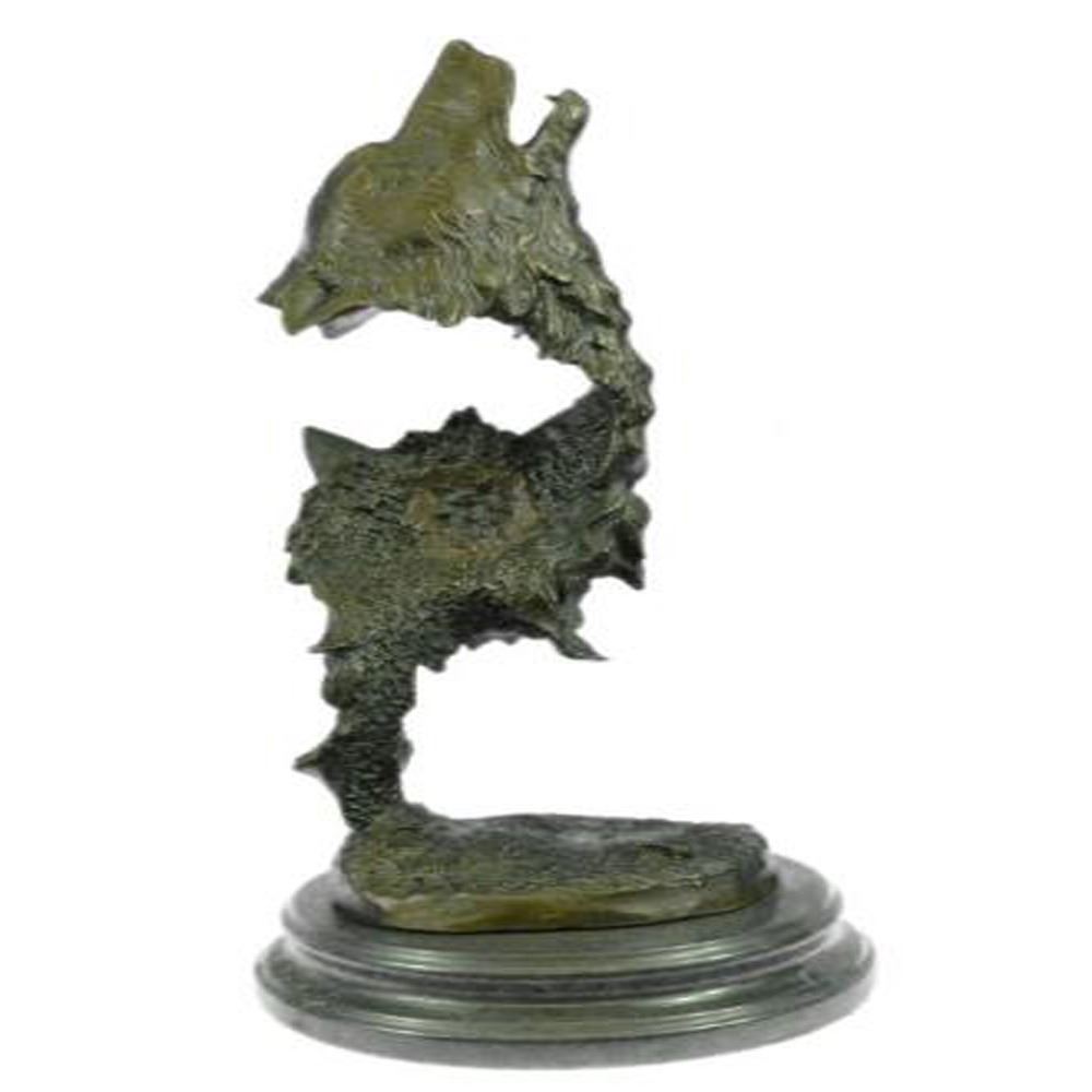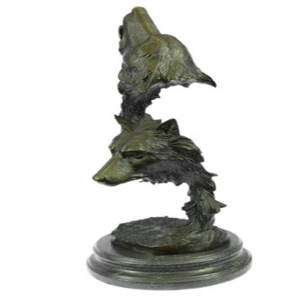 When people think of wolves they think of their lethal hunting skills, howling and the pack. The creation of a wolf family is unique for animals. Wolves are social predators that live in nuclear families consisting of a mated pair, offspring and occasionally adopted subordinates. They are a loyal bunch, protecting and providing for one another. This beautiful bust sculpture depicts two mated wolves, side by side. They resemble one another closely but one is slightly larger. Their ears perk and their sharp eyes gaze. Their beautiful coats are rugged and blow in the wind. They seem to blend into one another to become one, as a pack would. This dark brown patina sculpture was cast using the Lost Wax Method and mounted on a marble base. Bronze Dimensions with Marble Base: Height 19 X Width 8 Inches. Weight: 18 LBS.