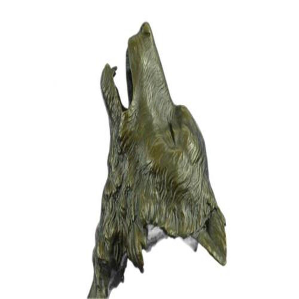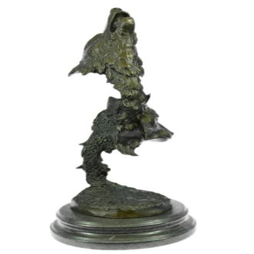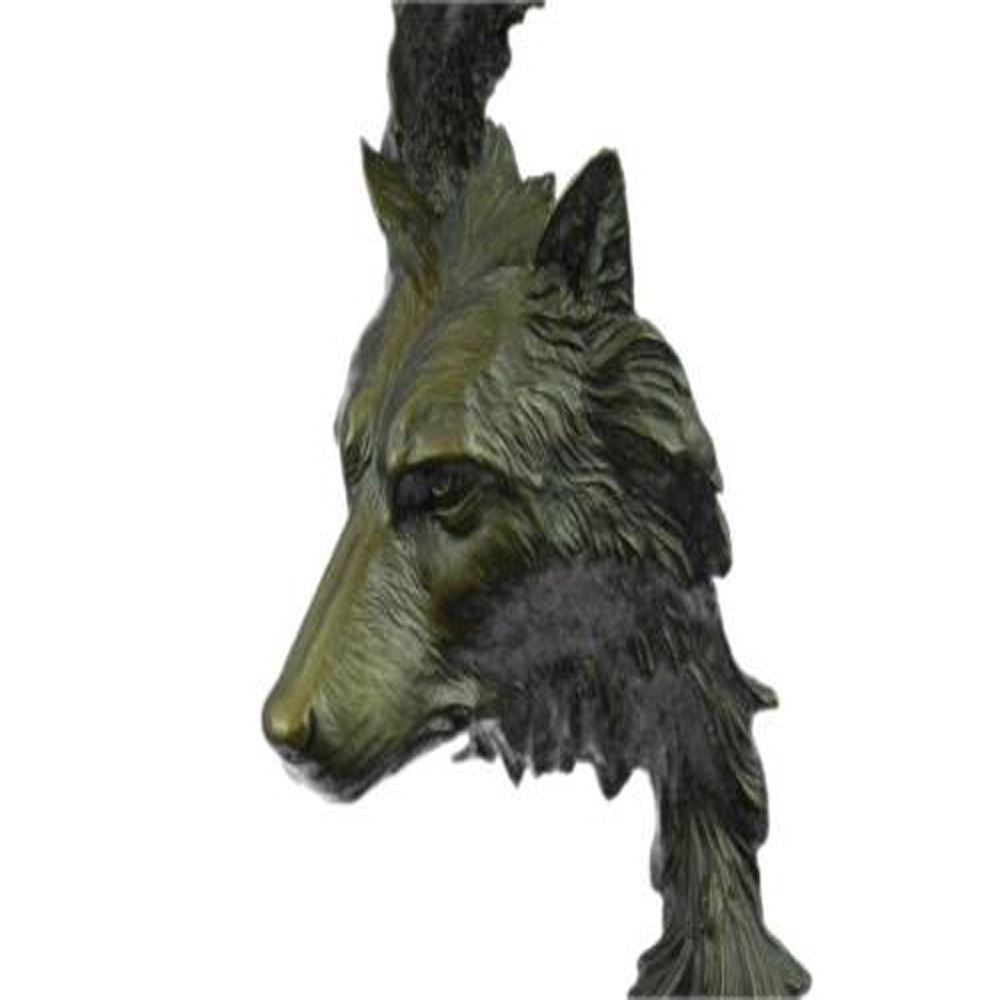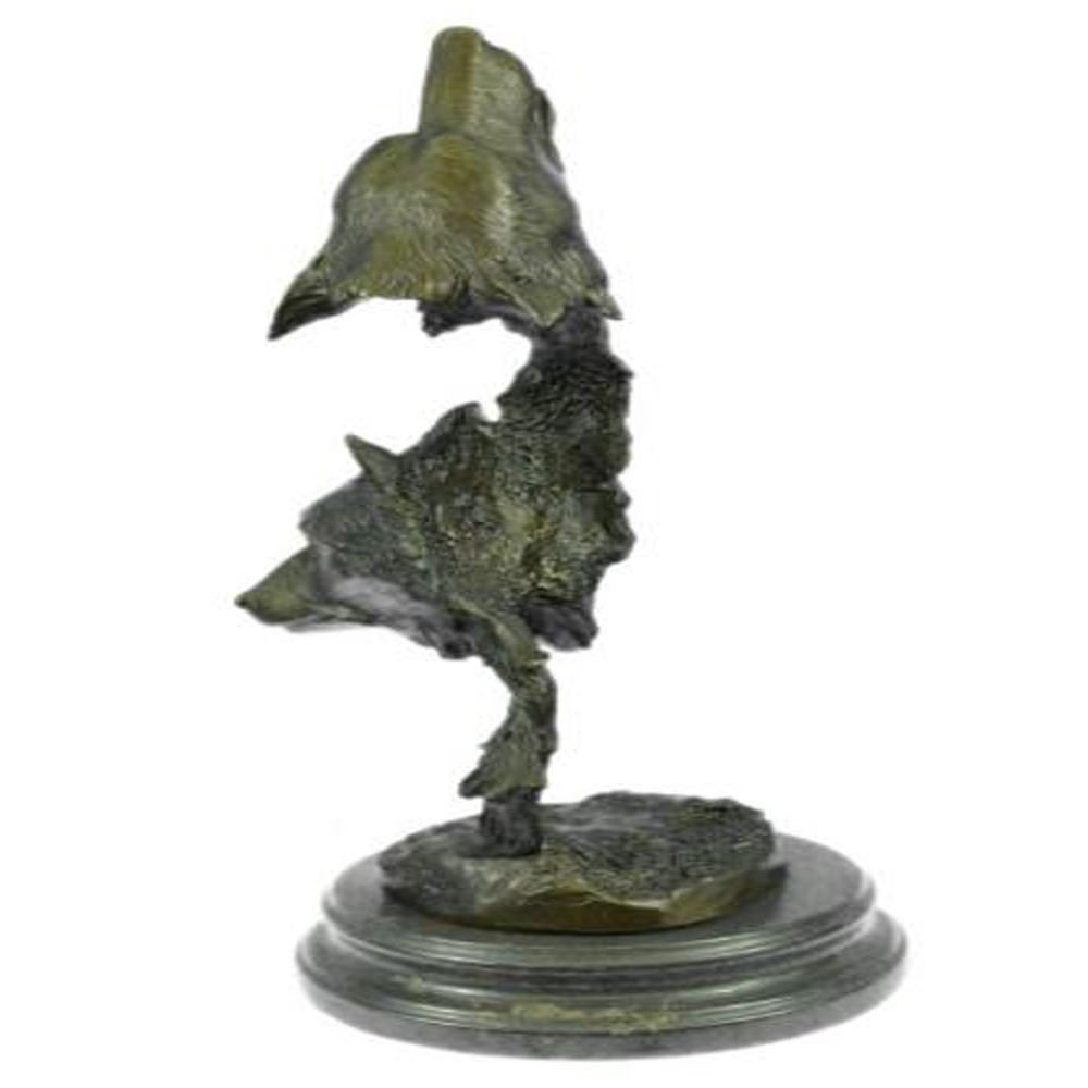 When people think of wolves they think of their lethal hunting skills, howling and the pack. The creation of a wolf family is unique for animals. Wolves are social predators that live in nuclear families consisting of a mated pair, offspring and occasionally adopted subordinates. They are a loyal bunch, protecting and providing for one another. This beautiful bust sculpture depicts two mated wolves, side by side. They resemble one another closely but one is slightly larger. Their ears perk and their sharp eyes gaze. Their beautiful coats are rugged and blow in the wind. They seem to blend into one another to become one, as a pack would. This dark brown patina sculpture was cast using the Lost Wax Method and mounted on a marble base. Bronze Dimensions with Marble Base: Height 19 X Width 8 Inches. Weight: 18 LBS.