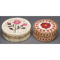 Two Woodland circular lidded birch bark boxes, each decorated with colourful quillwork and a band of sweetgrass, 5.5" - 14 cm.