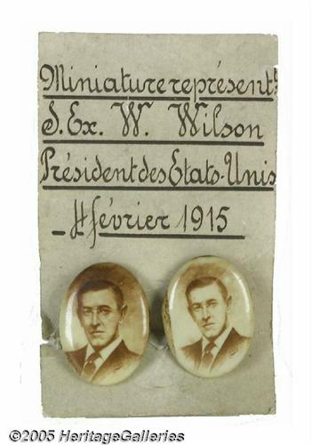 <B>Two Woodrow Wilson Oval Celluloid Pinbacks</B></I> This unlisted pair of Woodrow Wilson pinback buttons are 1" ovals and of different picture sizes. The sepia toned pins appear from the card to be made in France in 1915, prior to the U.S.'s entrance into World War I. This is the first time we have seen these examples. They have been samples. Lot:262