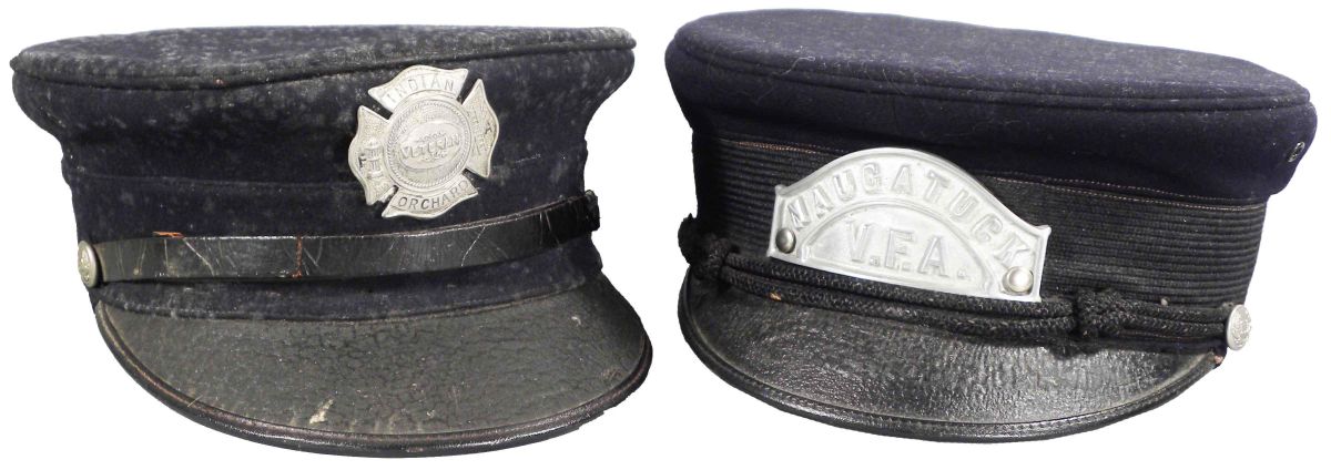 Lot of Two Wool Fireman Dress Caps with badges including Indian Orchard Mass, Naugatuck, CT. Fair to good condition.