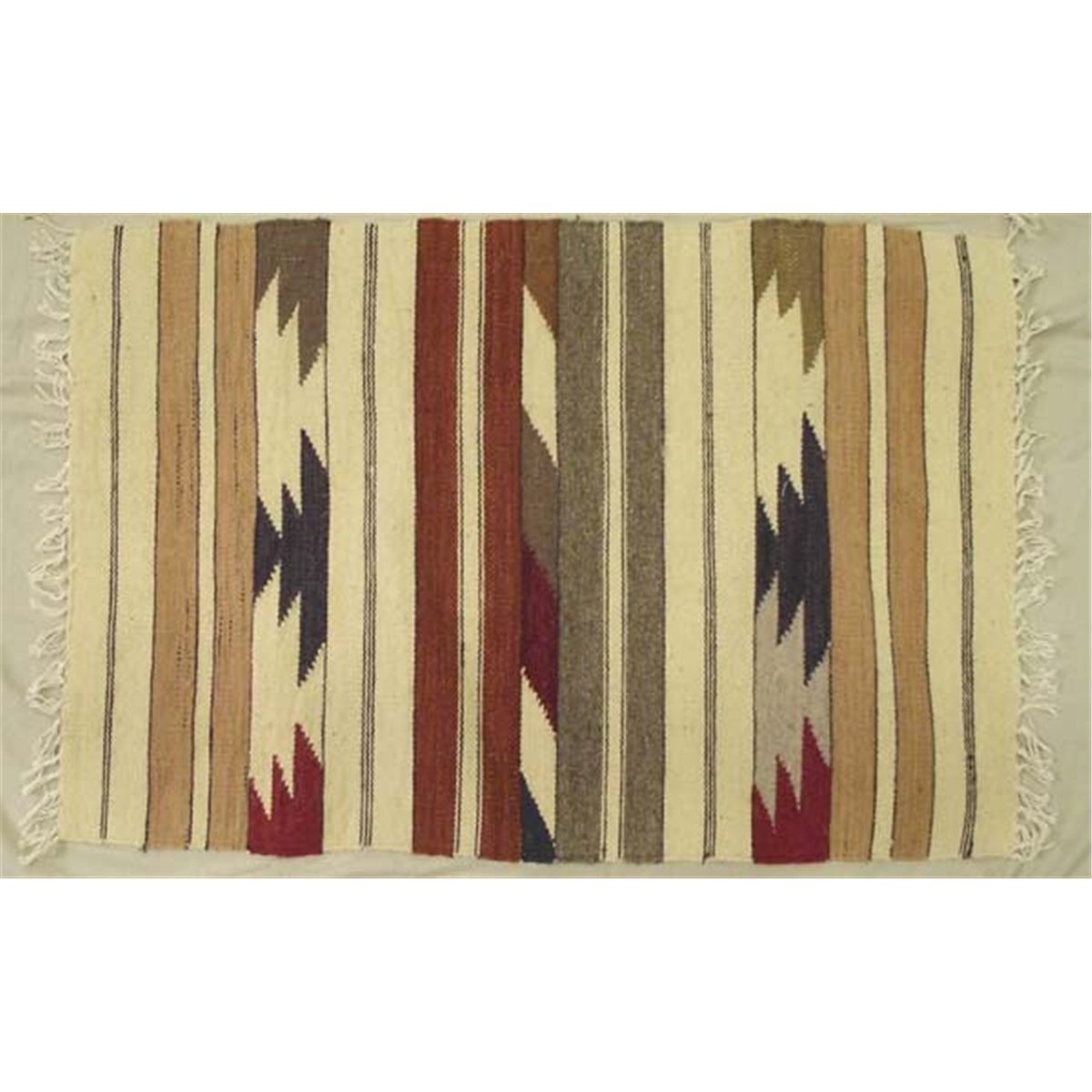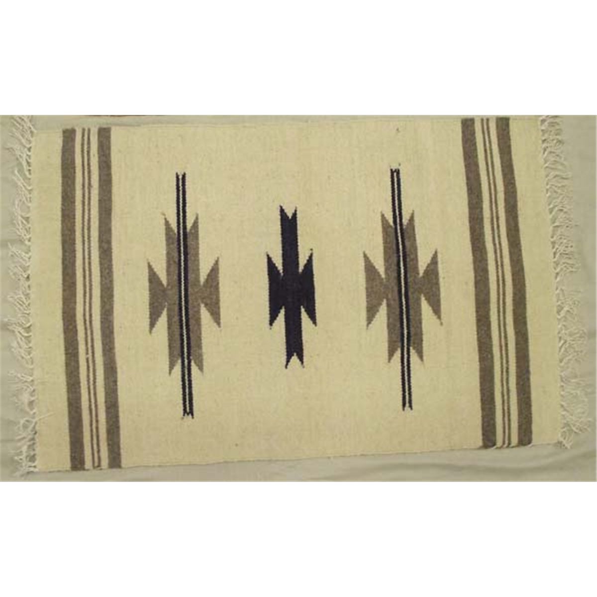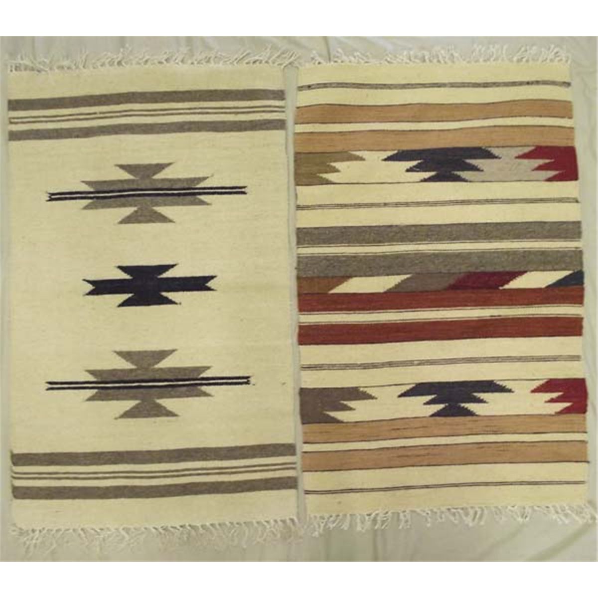 Two Wool Rugs Southwest Design. Each rug measures 2' x 3', southwestern designs on an oatmeal background with various stripes of black, grey, rust and tan. Condition is new. Buyers Pay Actual Shipping and Handling Charges(see terms and conditions for more information).