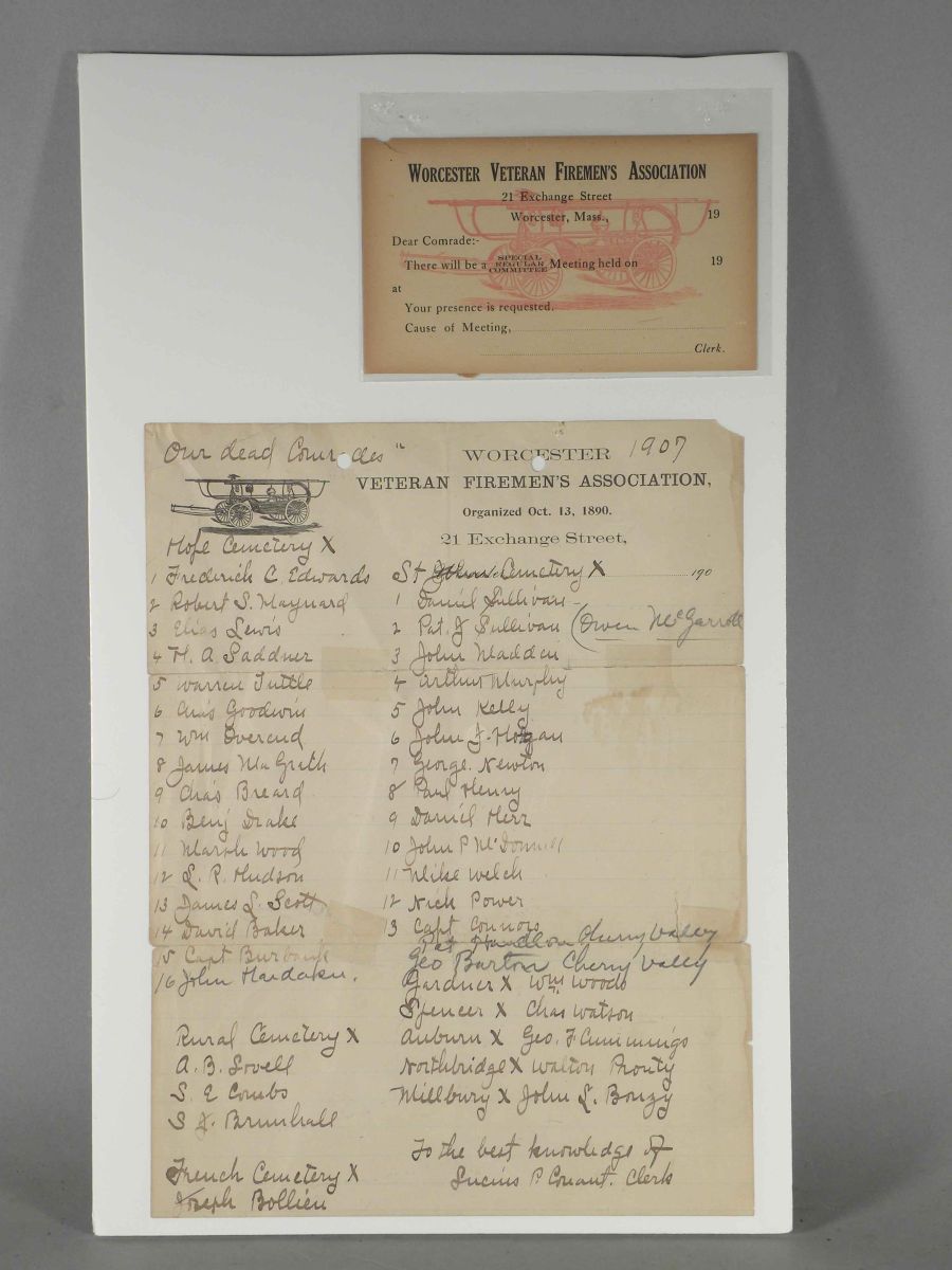 Lot of Two Worcester, Mass Veteran Firemen's Association items including meeting invitation and sign in sheet. Good original condition.