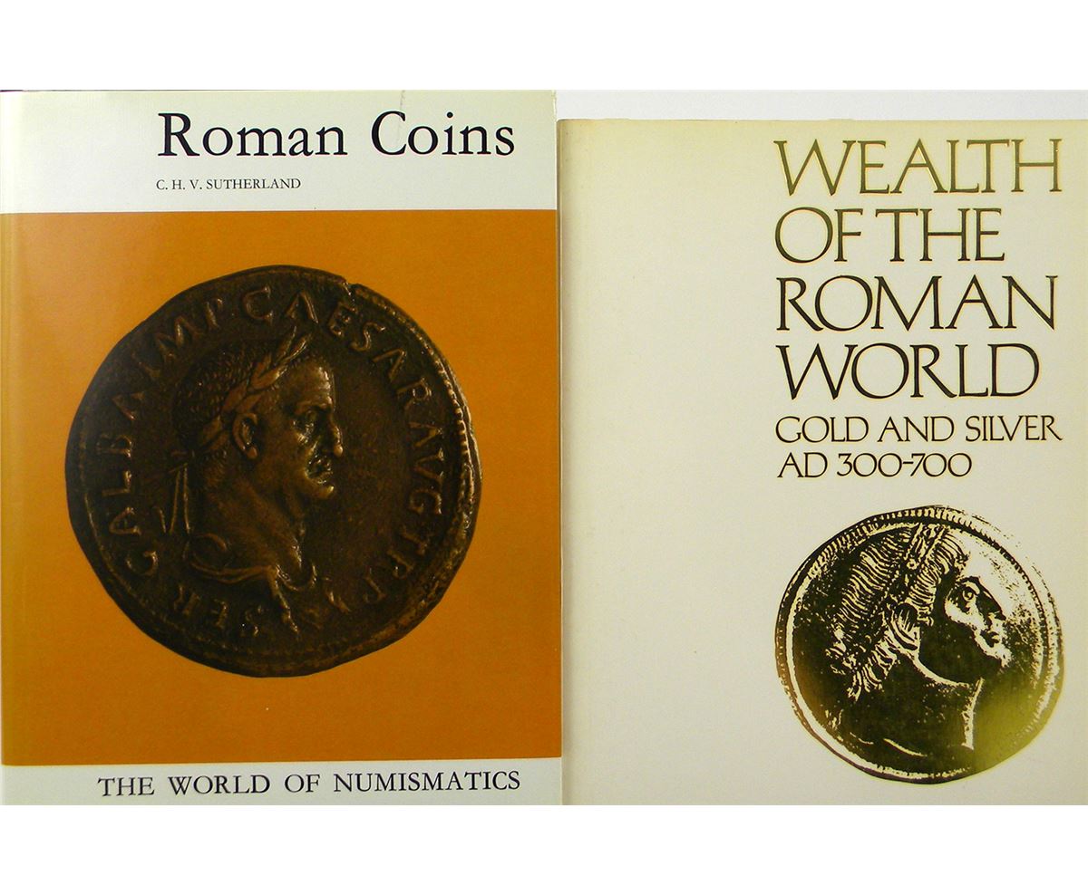 Sutherland, C.H.V. ROMAN COINS. New York, 1974. 8vo, original blue cloth, gilt; jacket; cardboard slipcase. 311, (1) pages; well illustrated, with numerous color plates. Fine. [with] Kent, J.P.C., and K.S. Painter. WEALTH OF THE ROMAN WORLD, AD 300-700. London, 1977. Small 4to, original printed card covers. 192 pages; illustrated; 12 color plates. Fine. First title Volume 2 in the World of Numismatics series. Clain-Stefanelli 3634*. Grierson 67. Kroh 70. Second title includes an illustrated chapter on "Coinage and Currency" and several color plates depicting gold coins. From the Herbert Kreindler library.